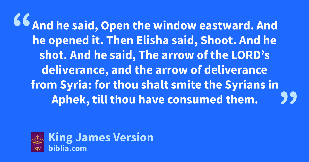 14 *Now qElisha was fallen sick of his sickness whereof he died. And Joash the king of Israel came down unto him, and wept over his face, and said, O rmy father, my father, the chariot of Israel, and the horsemen thereof. 15 And Elisha said unto him, Take bow and arrows. And he took unto him bow and arrows. 16 And he said to the king of Israel, †Put thine hand upon the bow. And he put his hand upon it: and Elisha put his hands upon the king’s hands. 17 And he said, Open the window eastward. And he opened it. Then Elisha said, Shoot. And he shot. And he said, The arrow of the Lord’s deliverance, and the arrow of deliverance from Syria: for thou shalt smite the Syrians in sAphek, till thou have consumed them. 18 And he said, Take the arrows. And he took them. And he said unto the king of Israel, Smite upon the ground. And he smote thrice, and stayed. 19 And tthe man of God was wroth with him, and said, Thou shouldest have smitten five or six times; then hadst thou smitten Syria till thou hadst consumed it: whereas now thou shalt smite Syria but uthrice. 20 *And Elisha died, and they buried him. And the bands of the wMoabites invaded the land at the coming in of the year. 21 And it came to pass, as they were burying a man, that, behold, they spied a band of men; and they cast the man into the sepulchre of Elisha: and when the man †was let down, and touched the bones of Elisha, xhe revived, and stood up on his feet.
