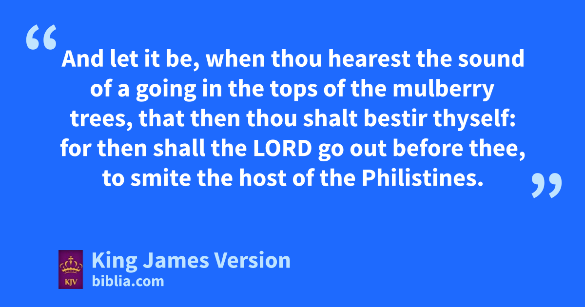 17 But when the Philistines heard that they had anointed David king over Israel, all the Philistines came up to seek David; and David heard of it, wand went down to the hold. 18 The Philistines also came and xspread themselves in ythe valley of Rephaim. 19 And David zinquired of the Lord, saying, Shall I go up to the Philistines? wilt thou deliver them into mine hand? And the Lord said unto David, Go up: for I will doubtless deliver the Philistines into thine hand. 20 And David came to aBaal-perazim, and David smote them there, and said, The Lord hath broken forth upon mine enemies before me, as the breach of waters. Therefore he called the name of that place ||Baal-perazim. 21 And there they left their images, and David and his men b||burned them. 22 And the Philistines came up yet again, and xspread themselves in the valley of Rephaim. 23 And when cDavid inquired of the Lord, he said, Thou shalt not go up; but fetch a compass behind them, and come upon them over against the mulberry trees. 24 And let it be, when thou dhearest the sound of a going in the tops of the mulberry trees, that then thou shalt bestir thyself: for then eshall the Lord go out before thee, to smite the host of the Philistines. 25 And David did so, as the Lord had commanded him; and smote the Philistines from ||Geba until thou come to fGazer.