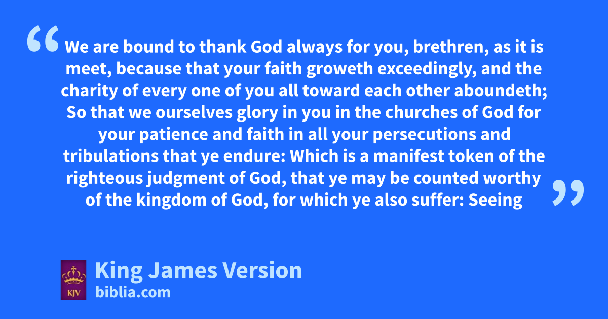 3 bWe are bound to cthank God always for you, brethren, as it is meet, because that your cfaith groweth exceedingly, and the ccharity of every one of you all toward each other aboundeth; 4 dSo that we ourselves glory in you in ethe churches of God for your cpatience and cfaith fin all your persecutions and tribulations that ye endure: 5 Which is ga manifest token of the righteous judgment of God, that ye may be hcounted worthy of the kingdom of God, ffor which ye also suffer: 6 iSeeing it is a righteous thing with God to recompense tribulation to them that trouble you; 7 And jto you who are troubled krest with us, when lthe Lord Jesus mshall be revealed from heaven nwith †his mighty angels, 8 oIn flaming fire ||ptaking vengeance on them qthat know not God, and rthat obey not the gospel of our Lord Jesus Christ: 9 sWho shall be punished with everlasting tdestruction ufrom the presence of the Lord, and wfrom the glory of his power; 10 wWhen he shall come xto be glorified in his saints, and to be admired in all them that believe (because our xxtestimony among you ywas believed) zin that day. 11 Wherefore also we pray always for you, that our God would ||hcount you worthy of this calling, and fulfil all the agood pleasure of his bgoodness, and cthe work of faith with power: 12 That the name of our Lord Jesus Christ dmay be glorified in you, and ye in him, according to the grace of our God and the Lord Jesus Christ.