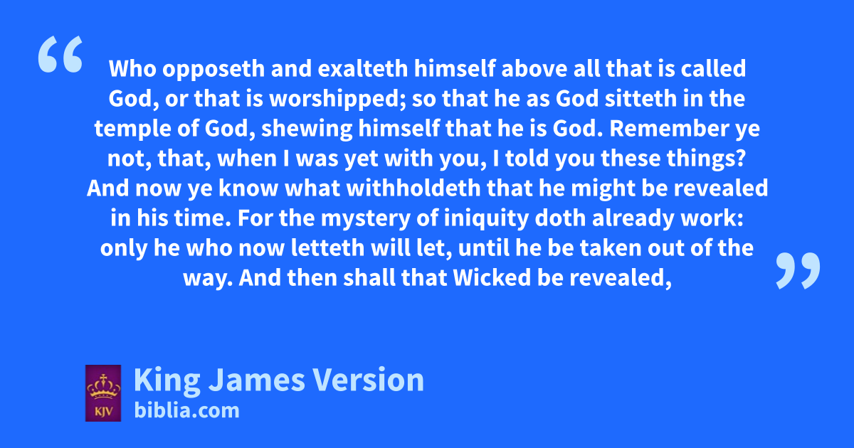 2 Now we beseech you, brethren, aby the coming of our Lord Jesus Christ, and by bour gathering together unto him, 2 That ye be not soon shaken in mind, or cbe troubled, neither dby spirit, nor eby word, nor eby letter as from us, as that fthe day of Christ is at hand. 3 gLet no man deceive you by any means: for that day shall not come, hexcept there come ia falling away first, and jthat man of sin be revealed, kthe son of perdition; 4 Who opposeth and jexalteth himself above all lthat is called God, or mthat is worshipped; so that he as God sitteth in the temple of God, shewing himself that he is God. 5 nRemember ye not, that, when I was yet with you, I told you these things? 6 And now ye know what ||owithholdeth that he might be revealed in his time. 7 For pthe mystery of qiniquity doth already work: only he who now oletteth will let, until he be taken out of the way. 8 And then shall that jqWicked be revealed, rwhom the Lord shall consume swith the spirit of his mouth, and shall destroy with tthe brightness of ahis coming: 9 Even him, whose coming is uafter the working of wSatan xwith all power and ysigns and lying ywonders, 10 And with all deceivableness of zunrighteousness in athem that perish; because they received not bthe love of zthe truth, that they might be saved. 11 And for this cause cGod shall send them strong delusion, that they should believe da lie: 12 That they all might be damned who ebelieved not zthe truth, but fhad pleasure in zunrighteousness.