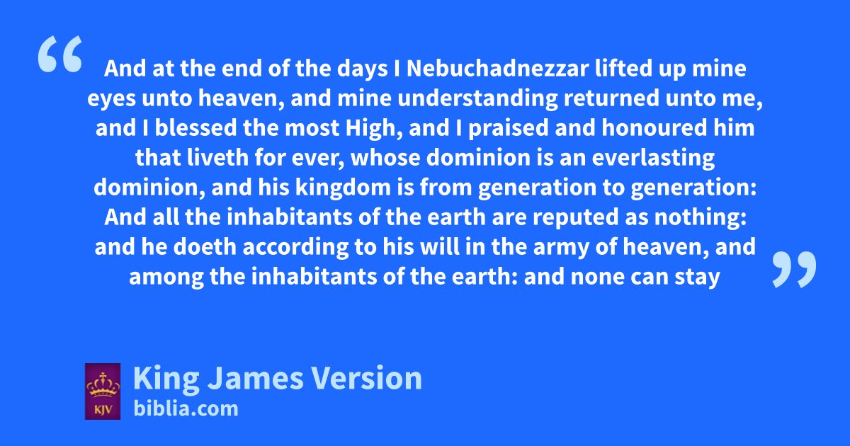 28 All this came upon the king Nebuchadnezzar. 29 At the end of twelve months he walked ||in the palace of the kingdom of Babylon. 30 mThe king spake, and said, Is not this great Babylon, that I have built for nthe house of the kingdom by othe might of omy power, and for opthe honour of pmy majesty? 31 *ppWhile the word was in the king’s mouth, there fell a voice from heaven, qsaying, O king Nebuchadnezzar, to thee qqit is spoken; The kingdom is departed from thee. 32 And rthey shall drive thee from men, and thy dwelling shall be with the beasts of the field: rthey shall make thee to eat grass as oxen, rand seven times shall pass over thee, runtil thou know that the most High ruleth in the kingdom of men, rand giveth it to whomsoever he will. 33 sThe same hour was the thing fulfilled upon Nebuchadnezzar: and he was driven from men, and did eat grass as oxen, and this body was wet with the dew of heaven, till his hairs were grown like eagles’ feathers, and his nails like birds’ claws. 34 And †uat the end of the days I Nebuchadnezzar lifted up uumine eyes unto heaven, and mine understanding returned unto me, and I blessed the most High, and I praised and vhonoured him vvthat liveth for ever, wwhose dominion is an everlasting dominion, and wxhis kingdom is from generation to generation: 35 And all ythe inhabitants of the earth zare reputed as nothing: and ahe doeth according to his will in the army of heaven, and among ythe inhabitants of the earth: and bnone can stay his hand, cor say unto him, cWhat doest thou? 36 At the same time uumy reason returned unto me; and for edthe glory of my kingdom, dmine honour and ddbrightness returned unto me; and my ecounsellers and my eelords sought unto me; and I fwas established in my kingdom, and excellent majesty gwas added unto me. 37 Now I Nebuchadnezzar hpraise and extol and hhonour ithe King of heaven, kall whose works are truth, and lhis ways judgment: and mthose that walk in pride he is able to abase.