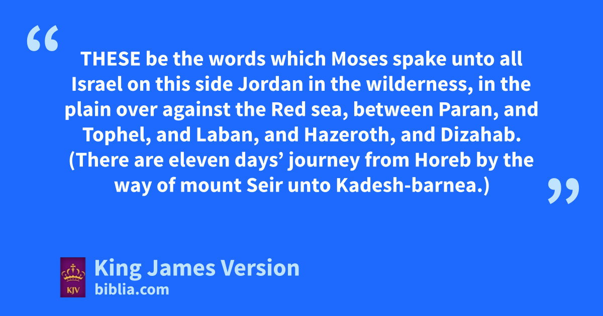 1 These be the words which Moses spake unto all Israel on this side Jordan in the wilderness, in the plain over against ||the Red sea, between aParan, and Tophel, and Laban, and bHazeroth, and Dizahab. 2 (There are eleven days’ journey from Horeb by the way of mount Seir unto cKadesh-barnea.) 3 *And it came to pass din the fortieth year, in the eleventh month, on the first day of the month, that Moses spake unto the children of Israel, according unto all that the Lord had given him in commandment unto them; 4 After he had slain eSihon the king of the Amorites, which dwelt in eHeshbon, and fOg the king of Bashan, which dwelt at Astaroth in fEdrei: 5 On this side Jordan, in the land of Moab, began Moses to declare this law, saying,