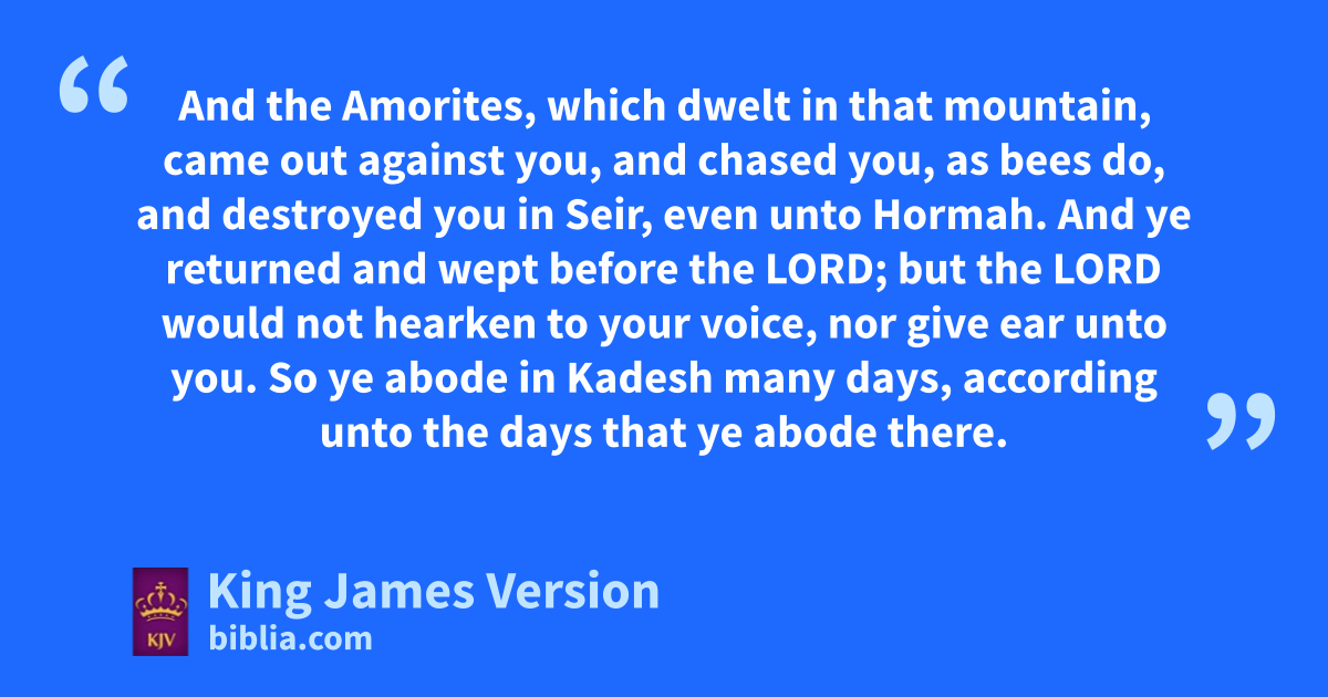 19 *And when we departed from Horeb, xwe went through all that great and terrible wilderness, which ye saw by the way of the mountain of the Amorites, as the Lord our God commanded us; and ywe came to Kadesh-barnea. 20 And I said unto you, Ye are come unto the mountain of the Amorites, which the Lord our God doth give unto us. 21 Behold, the Lord thy God hath set the land before thee: go up and possess it, as the Lord God of thy fathers hath said unto thee; fear not, neither zbe discouraged. 22 And ye came near unto me every one of you, and said, We will send men before us, and they shall search us out the land, and bring us word again by what way we must go up, and into what cities we shall come. 23 And the saying pleased me well: and aI took twelve men of you, one of a tribe: 24 And bthey turned and went up into the mountain, and came unto cthe valley of Eshcol, and searched it out. 25 And they took of the fruit of the land in their hands, and brought it down unto us, and brought us word again, and said, It is a good land which the Lord our God doth give us. 26 Notwithstanding ye would not go up, but drebelled against the commandment of the Lord your God: 27 And eye murmured in your tents, and said, Because the Lord fhated us, he hath brought us forth out of the land of Egypt, to deliver us into the hand of the Amorites, to destroy us. 28 Whither shall we go up? gour brethren have †discouraged our heart, saying, hThe people is greater and taller than we; the cities are great and walled up to heaven; and moreover we have seen the sons of the iAnakims there. 29 Then I said unto you, Dread not, neither be afraid of them. 30 The Lord your God which goeth before you, jhe shall fight for you, according to all that he did for you in Egypt before your eyes; 31 And in the wilderness, where thou hast seen how that the Lord thy God kbare thee, as a man doth bear his son, in all the way that ye went, until ye came into this place. 32 Yet in this thing lye did not believe the Lord your God, 33 mWho went in the way before you, nto search you out a place to pitch your tents in, in fire by night, to shew you by what way ye should go, and in a cloud by day. 34 And the Lord heard the voice of your words, and was wroth, oand sware, saying, 35 pSurely there shall not one of these men of this evil generation see that good land, which I sware to give unto your fathers, 36 qSave Caleb the son of Jephunneh; he shall see it, and to him will I give the land that he hath trodden upon, and to his children, because he hath †wholly followed the Lord. 37 Also the Lord rwas angry with me for your sakes, saying, Thou also shalt not go in thither. 38 But sJoshua the son of Nun, twhich standeth before thee, he shall go in thither: uencourage him: for he shall cause Israel to inherit it. 39 Moreover wyour little ones, which ye said should be a prey, and your children, which in that day xhad no knowledge between good and evil, they shall go in thither, and unto them will I give it, and they shall possess it. 40 But as for you, yturn you, and take your journey into the wilderness by the way of the Red sea. 41 Then ye answered and said unto me, zWe have sinned against the Lord, we will go up and fight, according to all that the Lord our God commanded us. And when ye had girded on every man his weapons of war, ye were ready to go up into the hill. 42 And the Lord said unto me, Say unto them, aGo not up, neither fight; for I am not among you; lest ye be smitten before your enemies. 43 So I spake unto you; and ye would not hear, but brebelled against the commandment of the Lord, and †went presumptuously up into the hill. 44 And cthe Amorites, which dwelt in that mountain, came out against you, and chased you, das bees do, and destroyed you in Seir, even unto Hormah. 45 And ye returned and wept before the Lord; but the Lord would not hearken to your voice, nor give ear unto you. 46 So eye abode in Kadesh many days, according unto the days that ye abode there.