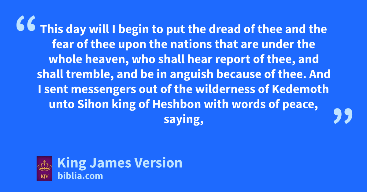 26 And I sent messengers out of the wilderness of Kedemoth unto Sihon king of Heshbon fwith words of peace, saying, 27 gLet me pass through thy land: I will go along by the high way, I will neither turn unto the right hand nor to the left. 28 hThou shalt sell me meat for money, that I may eat; and give me water for money, that I may drink: only I will pass through on my feet; 29 i(As the children of Esau which dwell in Seir, and the Moabites which dwell in Ar, did unto me;) until I shall pass over Jordan into the land which the Lord our God giveth us. 30 But kSihon king of Heshbon would not let us pass by him: for the Lord thy God lhardened his spirit, and made his heart obstinate, that he might deliver him into thy hand, as appeareth this day. 31 And the Lord said unto me, Behold, I have begun to give Sihon and his land before thee: mbegin to possess, that thou mayest inherit his land. 32 Then Sihon came out against us, he and all his people, to fight nat Jahaz. 33 And othe Lord our God delivered him before us; and pwe smote him, and his sons, and all his people. 34 And we took all his cities at that time, and qutterly destroyed †the men, and the women, and the little ones, of every city, we left none to remain: 35 Only the cattle we took for a prey unto ourselves, and the spoil of the cities which we took. 36 rFrom Aroer, which is by the brink of the river of Arnon, and from the city that is by the river, even unto Gilead, there was not one city too strong for us: sthe Lord our God delivered all unto us: 37 Only unto the land of the children of Ammon thou camest not, nor unto any place of the river tJabbok, nor unto the cities in the mountains, nor unto uwhatsoever the Lord our God forbad us.