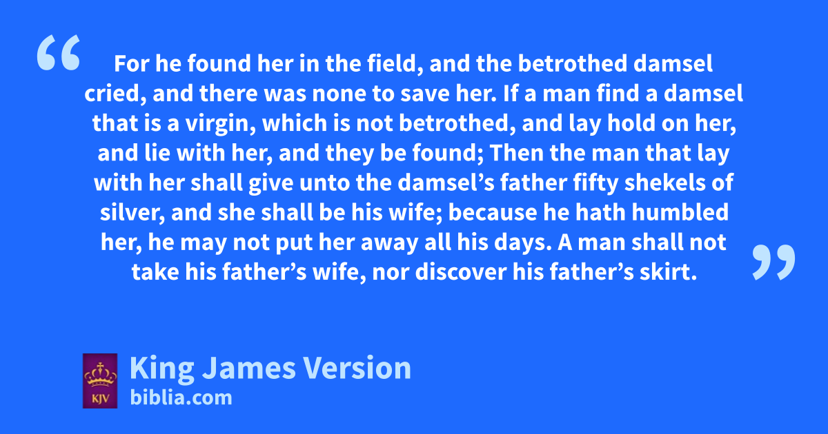 22 mIf a man be found lying with a woman married to an husband, then they shall both of them die, both the man that lay with the woman, and the woman: lso shalt thou put away evil from Israel. 23 If a damsel that is a virgin be nbetrothed unto an husband, and a man find her in the city, and lie with her; 24 Then ye shall bring them both out unto the gate of that city, and ye shall stone them with stones that they die; the damsel, because she cried not, being in the city; and the man, because he hath ohumbled his neighbour’s wife: pso thou shalt put away evil from among you. 25 But if a man find a betrothed damsel in the field, and the man ||force her, and lie with her: then the man only that lay with her shall die: 26 But unto the damsel thou shalt do nothing; there is in the damsel no sin worthy of death: for as when a man riseth against his neighbour, and slayeth him, even so is this matter: 27 For he found her in the field, and the betrothed damsel cried, and there was none to save her. 28 qIf a man find a damsel that is a virgin, which is not betrothed, and lay hold on her, and lie with her, and they be found; 29 Then the man that lay with her shall give unto the damsel’s father fifty shekels of silver, and she shall be his wife; because he hath rhumbled her, he may not put her away all his days.