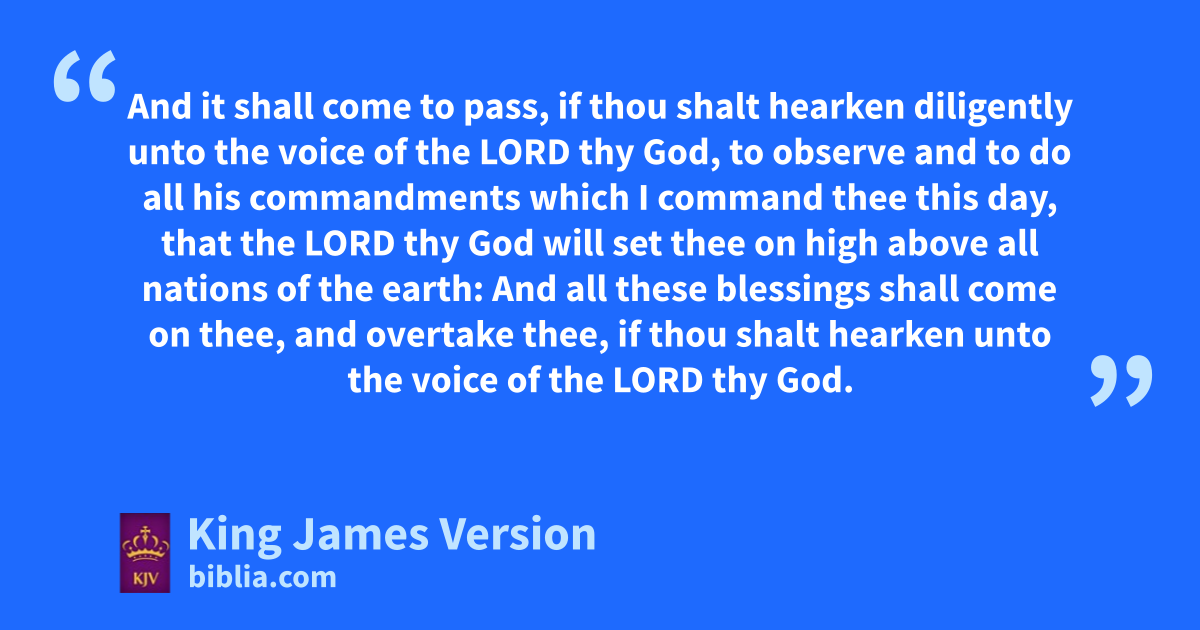 28 And it shall come to pass, aif thou shalt hearken diligently unto the voice of the Lord thy God, to observe and to do all his commandments which I command thee this day, that the Lord thy God will set thee on bhigh above all nations of the earth: 2 And all these blessings shall come on thee, and covertake thee, if thou shalt hearken unto the voice of the Lord thy God. 3 Blessed shalt thou be in the city, and blessed shalt thou be din the field. 4 Blessed shall be ethe fruit of thy body, and the fruit of thy ground, and the fruit of thy cattle, ethe increase of thy kine, and the flocks of thy sheep. 5 Blessed shall be thy fbasket and thy ||store. 6 Blessed shalt thou be gwhen thou comest in, and blessed shalt thou be when thou goest out. 7 The Lord hshall cause thine enemies that rise up against thee to be smitten before thy face: they shall come out against thee one way, and flee before thee seven ways. 8 The Lord shall icommand the blessing upon thee in thy ||storehouses, and in all that thou ksettest thine hand unto; and he shall bless thee in the land which the Lord thy God giveth thee. 9 lThe Lord shall establish thee an holy people unto himself, as he hath sworn unto thee, if thou shalt keep the commandments of the Lord thy God, and walk in his ways. 10 And all people of the earth shall see that thou art mcalled by the name of the Lord; and they shall be nafraid of thee. 11 And othe Lord shall make thee plenteous ||in goods, in the fruit of thy †body, and in the fruit of thy cattle, and in the fruit of thy ground, in the land which the Lord sware unto thy fathers to give thee. 12 The Lord shall open unto thee his good treasure, the heaven pto give the rain unto thy land in his season, and qto bless all the work of thine hand: and rthou shalt lend unto many nations, and thou shalt not borrow. 13 And the Lord shall make thee sthe head, and not the tail; and thou shalt be above only, and thou shalt not be beneath; if that thou hearken unto the commandments of the Lord thy God, which I command thee this day, to observe and to do them: 14 tAnd thou shalt not go aside from any of the words which I command thee this day, to the right hand, or to the left, to go after other gods to serve them.
