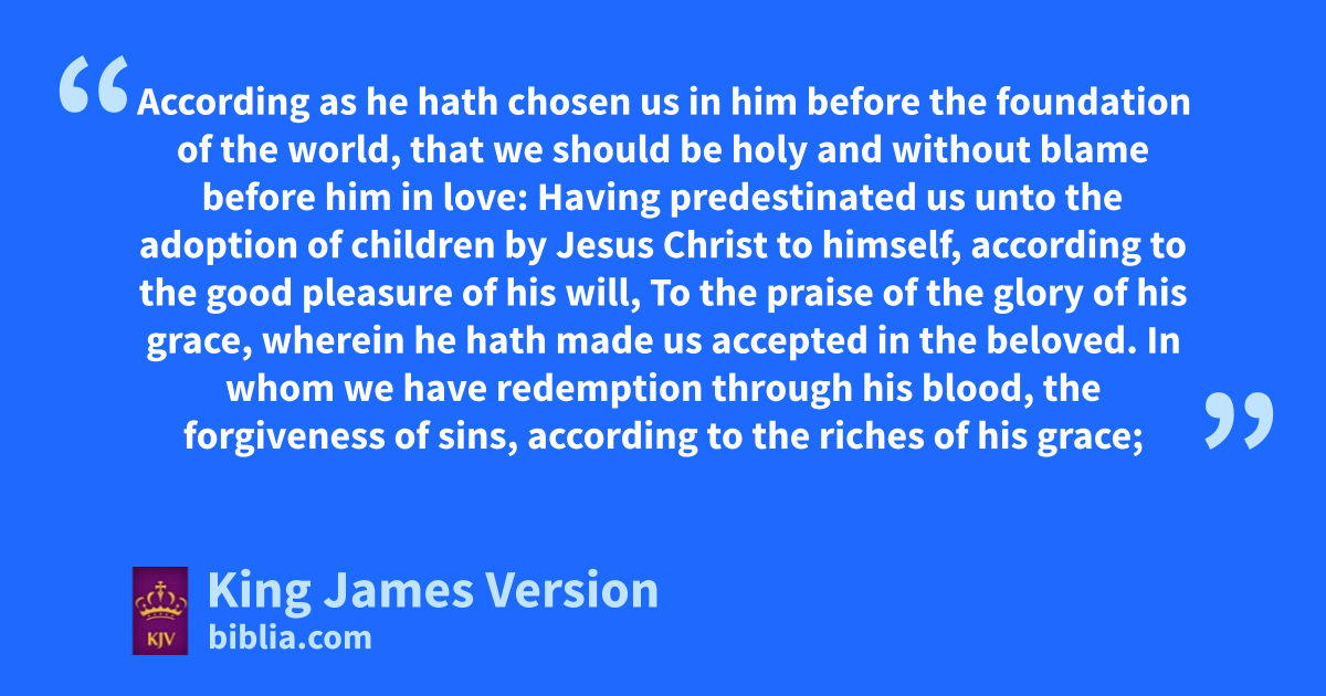 3 fBlessed be gthe God and Father of our Lord Jesus Christ, who hath blessed us with all spiritual blessings hin heavenly ||places in Christ: 4 According as ihe hath jchosen us in him kbefore the foundation of the world, that we should be lholy and without blame before him in love: 5 mHaving predestinated us unto nthe adoption of children by Jesus Christ to himself, oaccording to the good pleasure of his will, 6 To the praise of the glory of his grace, wherein he hath pmade us accepted in qthe beloved. 7 rIn whom we have sredemption tthrough his blood, uthe forgiveness of sins, according to vthe riches of his grace; 8 Wherein whe hath abounded toward us in all xwisdom and prudence; 9 yHaving made known unto us the mystery of his will, oaccording to his good pleasure which zhe hath purposed in himself: 10 That in the dispensation of athe fulness of times bhe might gather together in one call things in Christ, cboth which are in †heaven, and which are on earth; even in him: 11 In whom also dwe have obtained an inheritance, being predestinated eaccording to the purpose of him who worketh all things after fthe counsel of his own will: 12 That we should be gto the praise of his glory, who hfirst ||trusted in Christ. 13 In whom ye also trusted, iafter that ye heard kthe word of truth, the gospel of your salvation: in whom also lafter that ye believed, ye were msealed with that holy Spirit of promise, 14 Which is nthe earnest dof our inheritance until the oredemption of pthe purchased possession, gunto the praise of his glory.