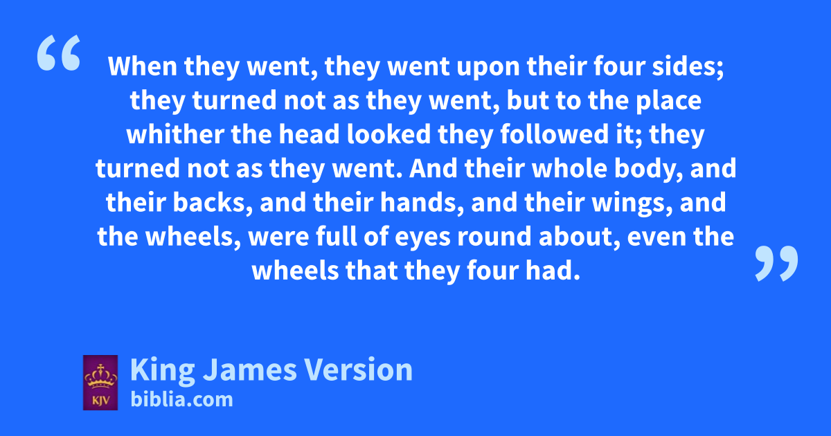 8 pAnd there appeared in the cherubims qthe form of a man’s hand under their wings. 9 rAnd when I looked, behold the four wheels by the cherubims, one wheel by one cherub, and another wheel by another cherub: and sthe appearance of the wheels was as tthe colour of a beryl stone. 10 And as for their appearances, sthey four had one likeness, sas if a wheel had been in the midst of a wheel. 11 uWhen they went, they went vupon their four sides; uthey turned not as they went, but wto the place whither the head looked they followed it; uthey turned not as they went. 12 And their whole †body, and xtheir backs, and their hands, and their wings, and the wheels, were xfull of eyes round about, even the wheels that they four had. 13 As for ethe wheels, ||it was cried unto them in my hearing, eO wheel. 14 zAnd every one had four faces: the first face was the face of a cherub, and athe second face was the face of a man, and athe third the face of a lion, and athe fourth the face of an eagle. 15 And the cherubims bwere lifted up. cThis is the living creature that I saw dby the river of Chebar. 16 eAnd when the cherubims went, the wheels went by them: eand when the cherubims lifted up their wings to mount up from the earth, the same wheels also turned not from beside them. 17 fWhen they stood, these stood; and when they were lifted up, these blifted up themselves also: for gthe spirit ||of the living creature was in them.