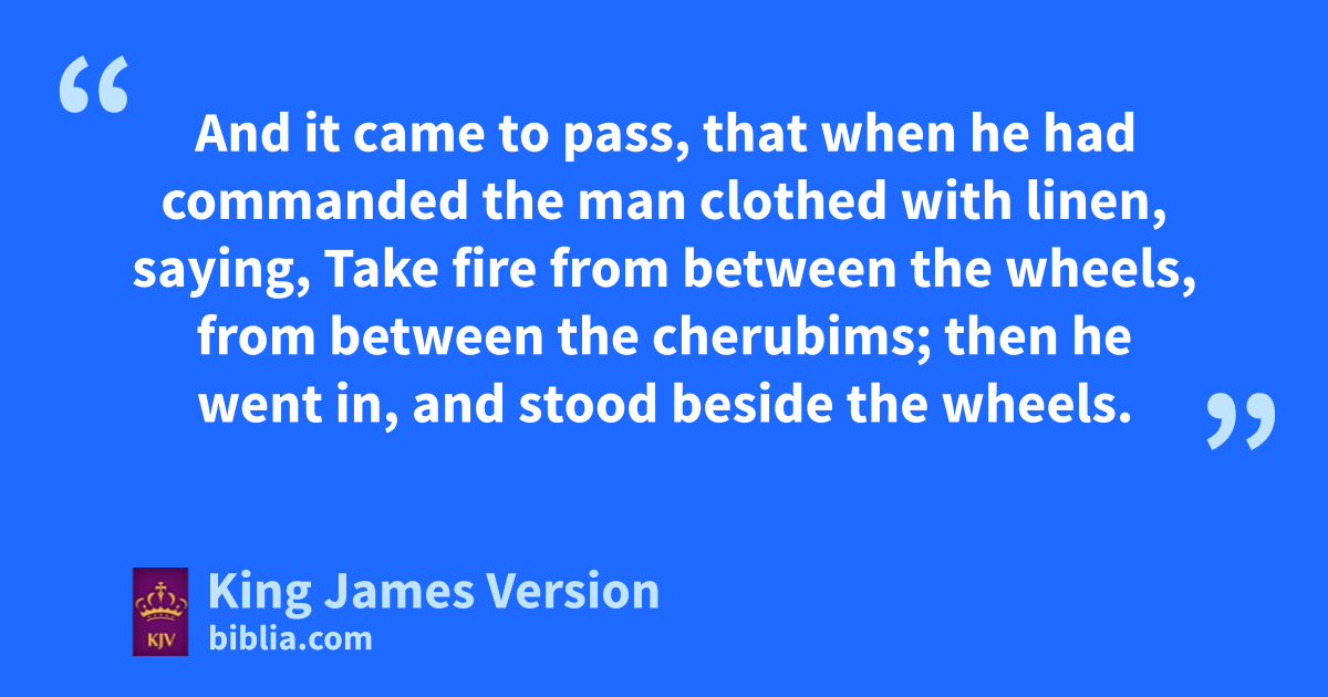 10 Then I looked, and, behold, in athe firmament that was above the head of the cherubims there appeared over them bas it were a sapphire stone, bas the appearance of the likeness of ca throne. 2 And he spake unto dthe man clothed with linen, and said, Go in between ethe wheels, even under the cherub, and fill †thine hand with fcoals of fire from between the cherubims, and gscatter them over the city. And he went in hin my sight. 3 Now the cherubims stood ion the right side of the house, when the man went in; and the cloud filled jthe inner court. 4 Then kthe glory of the Lord †went up from the cherub, and stood over lthe threshold of the house; and mthe house was filled with the cloud, and the court was full of knthe brightness of the Lord’s glory. 5 And nnthe sound of the cherubims’ wings was heard even to the outer court, nas the voice of the Almighty God when he speaketh. 6 And it came to pass, that when he had commanded dthe man clothed with linen, saying, oTake fire from between ethe wheels, from between the cherubims; then he went in, and stood beside the wheels. 7 And one cherub †stretched forth his hand from between the cherubims unto the fire that was between the cherubims, and took thereof, and put it into othe hands of dhim that was clothed with linen: who took it, and went out.