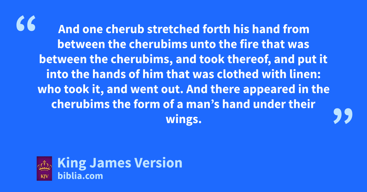 10 Then I looked, and, behold, in athe firmament that was above the head of the cherubims there appeared over them bas it were a sapphire stone, bas the appearance of the likeness of ca throne. 2 And he spake unto dthe man clothed with linen, and said, Go in between ethe wheels, even under the cherub, and fill †thine hand with fcoals of fire from between the cherubims, and gscatter them over the city. And he went in hin my sight. 3 Now the cherubims stood ion the right side of the house, when the man went in; and the cloud filled jthe inner court. 4 Then kthe glory of the Lord †went up from the cherub, and stood over lthe threshold of the house; and mthe house was filled with the cloud, and the court was full of knthe brightness of the Lord’s glory. 5 And nnthe sound of the cherubims’ wings was heard even to the outer court, nas the voice of the Almighty God when he speaketh. 6 And it came to pass, that when he had commanded dthe man clothed with linen, saying, oTake fire from between ethe wheels, from between the cherubims; then he went in, and stood beside the wheels. 7 And one cherub †stretched forth his hand from between the cherubims unto the fire that was between the cherubims, and took thereof, and put it into othe hands of dhim that was clothed with linen: who took it, and went out.