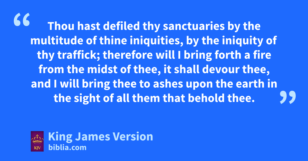 11 Moreover the word of the Lord came unto me, saying, 12 Son of man, utake up a lamentation upon athe king of Tyrus, and say unto him, Thus saith the Lord God; Thou sealest up vthe sum, hfull of wisdom, and wperfect in beauty. 13 Thou hast been in xEden the garden of God; every precious stone was thy covering, ythe ||sardius, yztopaz, and athe diamond, bthe ||beryl, cthe onyx, and dthe jasper, ethe sapphire, fthe ||emerald, and gthe carbuncle, and cgold: hthe workmanship of thy itabrets and of thy pipes was prepared in thee in kthe day that thou wast created. 14 Thou art the anointed lcherub that covereth; and I have set thee so: thou wast upon mthe holy mountain of God; thou hast walked up and down in the midst of nthe stones of fire. 15 Thou wast perfect in thy ways from kthe day that thou wast created, till iniquity was found in thee. 16 By the multitude of othy merchandise they have filled the midst of thee with violence, and thou hast sinned: therefore I will cast thee as profane out of mthe mountain of God: and I will destroy thee, lO covering cherub, from the midst of nthe stones of fire. 17 pThine heart was lifted up because of qthy beauty, thou hast corrupted qthy wisdom by reason of thy brightness: I will cast thee to the ground, I will lay thee before kings, that they may behold thee. 18 rThou hast defiled thy sanctuaries by the multitude of thine iniquities, by the iniquity of othy traffick; therefore swill I bring forth a fire from the midst of thee, it shall devour thee, and I will bring thee to ashes upon the earth in the sight of all them that behold thee. 19 All they that know thee among the people tshall be astonished at thee: uthou shalt be †a terror, and never shalt thou be any more.