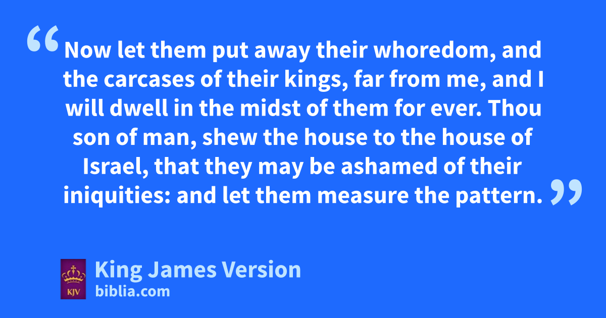 43 Afterward he brought me to the gate, even athe gate that looketh toward the east: 2 And, behold, bthe glory of the God of Israel came from the way of the east: and chis voice was like a noise of many waters: and dthe earth shined with his glory. 3 And it was eaccording to the appearance of the vision which I saw, even according to the vision that I saw ||when I came fto destroy the city: and the visions were like the vision that I saw gby the river Chebar; and eI fell upon my face. 4 And bhthe glory of the Lord came into the house by the way of athe gate whose prospect is toward the east. 5 So ithe spirit took me up, and brought me into kthe inner court; and, behold, lthe glory of the Lord filled the house. 6 And I heard him speaking unto me out of the house; and mthe man stood by me. 7 And he said unto me, Son of man, nthe place of my throne, and othe place of the soles of my feet, pwhere I will dwell qin the midst of the children of Israel for ever, and rmy holy name, shall the house of Israel rsno more defile, neither they, nor their kings, tby their whoredom, nor tby the carcases of their kings in their high places. 8 uIn their setting of their threshold by vmy thresholds, and their post by wmy posts, ||and xthe wall between me and them, rythey have even defiled my holy name by their abominations that they have committed: wherefore I have consumed them in mine anger. 9 Now let them put away ttheir whoredom, and tthe carcases of their kings, far from me, and pI will dwell in the midst of them for ever.