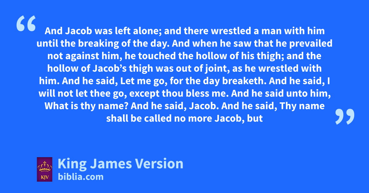 24 And Jacob was left alone; and there lwrestled a man with him until the †breaking of the day. 25 And when he saw that he prevailed not against him, he touched the hollow of his thigh; and the hollow of Jacob’s thigh was out of joint, as he wrestled with him. 26 And he said, mLet me go, for the day breaketh. And he said, I will not let thee go, except thou bless me. 27 And he said unto him, What is thy name? And he said, Jacob. 28 And he said, nThy name shall be called no more Jacob, but ||Israel: for as a prince hast thou power with God and owith men, and hast prevailed. 29 And Jacob asked him, and said, Tell me, I pray thee, thy name. And he said, pWherefore is it that thou dost ask after my name? And he blessed him there. 30 And Jacob called the name of the place ||Peniel: for qI have seen God face to face, and my life is preserved. 31 And as he passed over rPenuel the sun rose upon him, and he shalted upon his thigh. 32 Therefore the children of Israel eat not of the sinew which tshrank, which is upon the hollow of the thigh, unto this day: because he touched the hollow of Jacob’s thigh in the sinew that shrank.