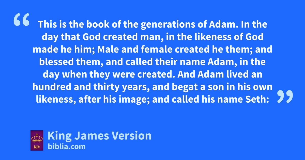 5 This is the book of the generations of Adam. In the day that God created man, in athe likeness of God made he him; 2 Male and female created he them; and blessed them, and called their name Adam, in the day when they were created. 3 And Adam lived an hundred and thirty years, and begat a son in his own likeness, after his image; and bcalled his name Seth: 4 cAnd the days of Adam after he had begotten Seth were eight hundred years: and he begat sons and daughters: 5 And all the days that Adam lived were nine hundred and thirty years: dand he died. 6 And Seth lived an hundred and five years, and ebegat †Enos: 7 And Seth lived after he begat Enos eight hundred and seven years, and begat sons and daughters: 8 And all the days of Seth were nine hundred and twelve years: and he died. 9 And Enos lived ninety years, and begat †Cainan: 10 And Enos lived after he begat Cainan eight hundred and fifteen years, and begat sons and daughters: 11 And all the days of Enos were nine hundred and five years: and he died. 12 And Cainan lived seventy years, and begat †Mahalaleel: 13 And Cainan lived after he begat Mahalaleel eight hundred and forty years, and begat sons and daughters: 14 And all the days of Cainan were nine hundred and ten years: and he died. 15 And Mahalaleel lived sixty and five years, and begat †Jared: 16 And Mahalaleel lived after he begat Jared eight hundred and thirty years, and begat sons and daughters: 17 And all the days of Mahalaleel were eight hundred ninety and five years: and he died. 18 And Jared lived an hundred sixty and two years, and he begat fEnoch: 19 And Jared lived after he begat Enoch eight hundred years, and begat sons and daughters: 20 And all the days of Jared were nine hundred sixty and two years: and he died. 21 And Enoch lived sixty and five years, and begat †Methuselah: 22 And Enoch gwalked with God after he begat Methuselah three hundred years, and begat sons and daughters: 23 And all the days of Enoch were three hundred sixty and five years: 24 And hEnoch walked with God: and he was not; for God took him. 25 And Methuselah lived an hundred eighty and seven years, and begat Lamech: 26 And Methuselah lived after he begat †Lamech seven hundred eighty and two years, and begat sons and daughters: 27 And all the days of Methuselah were nine hundred sixty and nine years: and he died. 28 And Lamech lived an hundred eighty and two years, and begat a son: 29 And he called his name †Noah, saying, This same shall comfort us concerning our work and itoil of our hands, because of the ground kwhich the Lord hath cursed. 30 And Lamech lived after he begat Noah five hundred ninety and five years, and begat sons and daughters: 31 And all the days of Lamech were seven hundred seventy and seven years: and he died. 32 And Noah was five hundred years old: and Noah begat Shem, Ham, and lJapheth.