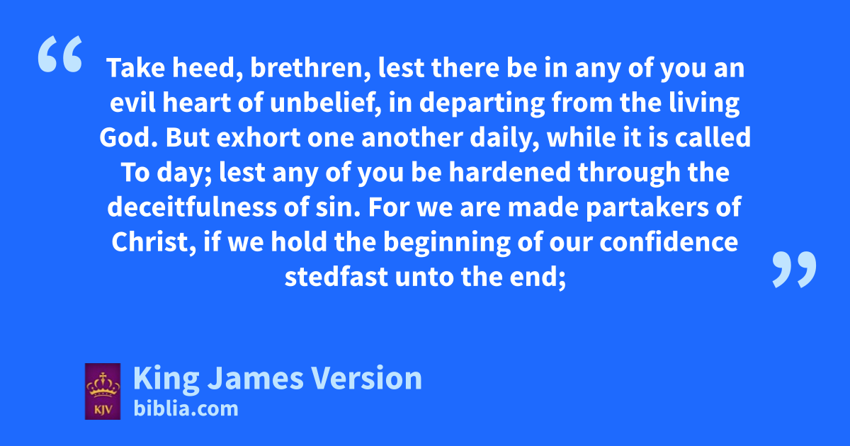 12 Take heed, brethren, lest there be in any of you an evil heart of unbelief, in departing from ythe living God. 13 But zexhort one another daily, while it is called To day; lest any of you be hardened athrough the deceitfulness of sin. 14 For we are made partakers of Christ, if we bhold the beginning of our cconfidence bstedfast unto the end; 15 While it is said, dTo day if ye will hear his voice, harden not your hearts, as in the provocation. 16 For esome, when they had heard, did fprovoke: howbeit gnot all that came out of Egypt by Moses. 17 But with whom was he grieved forty years? was it not with them that had sinned, hwhose icarcases fell in the wilderness? 18 And kto whom sware he that they should not enter into his rest, but to them that lbelieved not? 19 So we see that mthey could not enter in because of nunbelief.