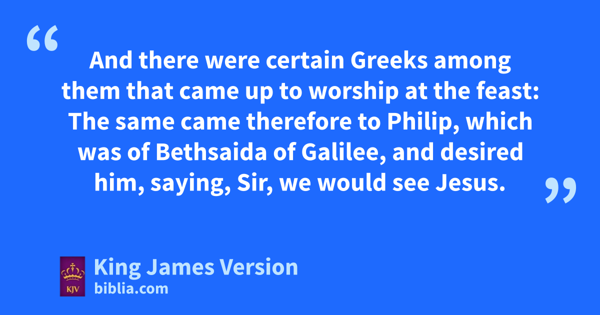 20 And there were certain iGreeks among them kthat came up to worship lat the feast: 21 The same came therefore to mPhilip, which was of nBethsaida of Galilee, and desired him, saying, Sir, we would see Jesus. 22 Philip cometh and telleth mAndrew: and again Andrew and Philip tell Jesus. 23 And Jesus answered them, saying, oThe hour is come, that the Son of man dshould be glorified. 24 Verily, verily, I say unto you, pExcept a corn of wheat fall into the ground and die, it abideth alone: but if it die, it bringeth forth much fruit. 25 qHe that loveth his life shall lose it; and he that rhateth his life in this world shall keep it unto life eternal. 26 If any man serve me, let him follow me; and swhere I am, there shall also my servant be: if any man serve me, thim will my Father honour. 27 uNow is my soul troubled; and what shall I say? wFather, save me from xthis hour: but yfor this cause came I unto xthis hour. 28 wFather, glorify thy name. zThen came there a voice from heaven, saying, I have both glorified it, and will glorify it again. 29 The people therefore, that stood by, and heard it, said that it thundered: others said, An angel spake to him. 30 Jesus answered and said, aThis voice came not because of me, but for your sakes. 31 Now is bthe judgment of this world: now shall cthe prince of this world be dcast out. 32 And I, if I be elifted up from the earth, fwill draw gall men unto me. 33 hThis he said, isignifying what death he should die. 34 The people answered him, We have heard out of jthe law kthat Christ abideth for ever: and how sayest thou, The Son of man must be elifted up? who is this Son of man? 35 Then Jesus said unto them, lYet a little while is mthe light nwith you. oWalk while ye have the light, lest darkness come upon you: for phe that walketh in darkness knoweth not whither he goeth. 36 While ye have light, believe in the light, that ye may be qthe children of light. These things spake Jesus, and departed, and rdid hide himself from them.