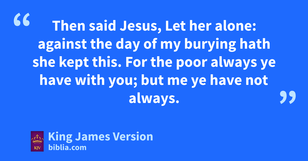 12 Then aJesus six days before bthe passover came to cBethany, where dLazarus was which had been dead, whom he raised from the dead. 2 There ethey made him a supper; and fgMartha served: but Lazarus was one of them that sat at the table with him. 3 Then took gMary ha pound of ointment of spikenard, very costly, and ianointed the feet of Jesus, and kwiped his feet with her hair: and the house was filled with the odour of the ointment. 4 Then saith one of his disciples, Judas Iscariot, lSimon’s son, which should betray him, 5 Why was not this ointment sold mfor three hundred pence, and given to the poor? 6 This he said, not that he cared for the poor; but because he was a thief, and nhad the bag, and obare what was put therein. 7 Then said Jesus, Let her alone: against the day of my pburying hath she kept this. 8 For the poor always ye have with you; but me ye have not always.