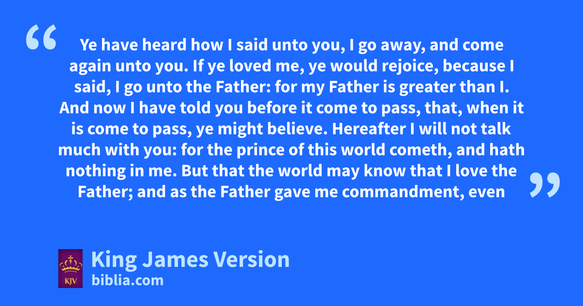 25 These things have I spoken unto you, being yet present with you. 26 But uthe Comforter, which is the Holy Ghost, whom xthe Father will send in my name, yhe shall teach you all things, and bring all things to your remembrance, whatsoever I have said unto you. 27 zPeace I leave with you, amy peace I give unto you: not bas the world giveth, give I unto you. cLet not your heart be troubled, neither let it be afraid. 28 Ye have heard how dI said unto you, I go away, and ecome again unto you. If ye loved me, ye would rejoice, because I said, fI go unto the Father: for gmy Father is greater than I. 29 And hnow I have told you before it come to pass, that, when it is come to pass, ye might believe. 30 iHereafter I will not talk much with you: for jthe prince of this world cometh, and khath nothing in me. 31 But lthat the world may know that I love mthe Father; and as the Father gave me commandment, even so I do. nArise, let us go hence.