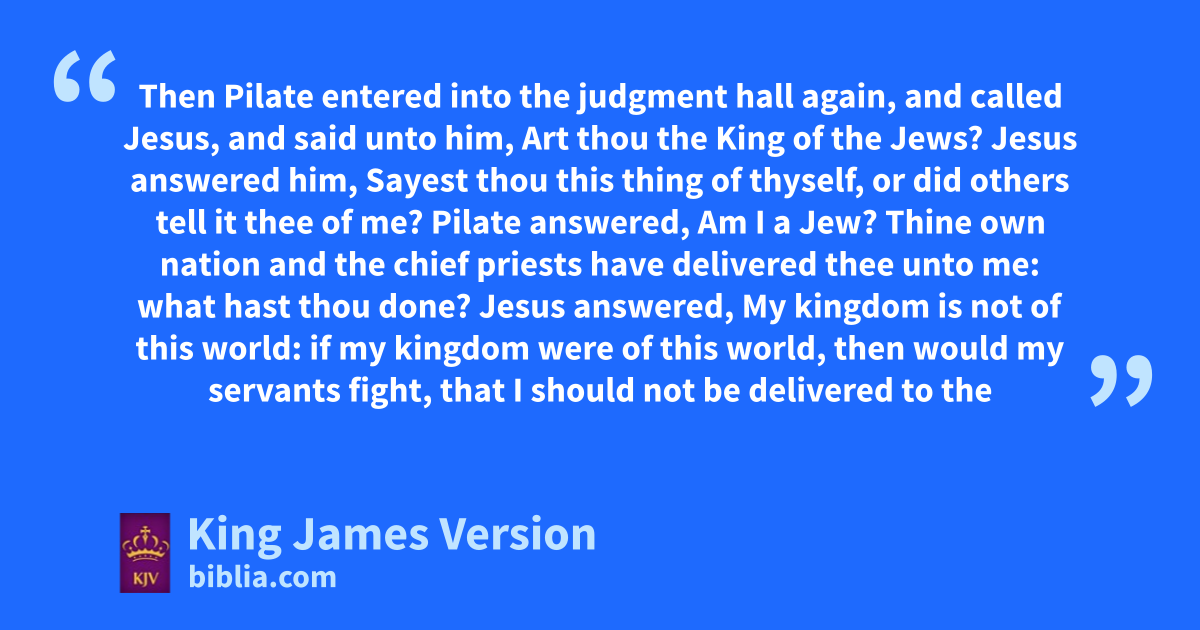 28 qThen led they Jesus from rCaiaphas unto ||the hall of judgment: and it was early; and they themselves went not into the judgment hall, slest they should be defiled; but tthat they might eat the passover. 29 uPilate then went out unto them, and said, What accusation bring ye against this man? 30 They answered and said unto him, If he were not a xmalefactor, we would not have delivered him up unto thee. 31 Then said Pilate unto them, Take ye him, and yjudge him according to your law. The Jews therefore said unto him, It is not lawful for us to put any man to death: 32 That the saying of Jesus might be fulfilled, which he spake, zsignifying what death he should die. 33 Then Pilate entered into the judgment hall again, and called Jesus, and said unto him, aArt thou the King of the Jews? 34 Jesus answered him, Sayest thou this thing of thyself, or did others tell it thee of me? 35 Pilate answered, Am I a Jew? Thine own nation and the chief priests have delivered thee unto me: what hast thou done? 36 Jesus answered, bMy kingdom is not cof this world: if my kingdom were cof this world, then would dmy servants efight, that I should not fbe delivered to the Jews: but now is my kingdom not from hence. 37 Pilate therefore said unto him, Art thou a king then? Jesus answered, gThou sayest that I am a king. hTo this end was I born, and for this cause came I into the world, that I should ibear witness unto kthe truth. lEvery one that is of the truth heareth my voice. 38 Pilate saith unto him, What is truth? And when he had said this, he mwent out again unto the Jews, and saith unto them, nI find in him no fault at all. 39 oBut ye have a custom, that I should release unto you one at the passover: will ye therefore that I release unto you the King of the Jews? 40 Then cried they all pagain, saying, qNot this man, but Barabbas. Now Barabbas was ra robber.