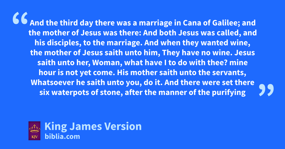 2 And athe third day there was a marriage in bCana of Galilee; and the mother of Jesus was there: 2 And both Jesus was called, and chis disciples, to dthe marriage. 3 And when they wanted wine, the mother of Jesus saith unto him, They have no wine. 4 Jesus saith unto her, eWoman, fwhat have I to do with thee? gmine hour is not yet come. 5 His mother saith unto the servants, Whatsoever he saith unto you, do it. 6 And there were set there six waterpots of stone, after the manner of hthe purifying of the Jews, containing two or three ifirkins apiece. 7 Jesus saith unto them, Fill the waterpots with water. And they filled them up to the brim. 8 And he saith unto them, Draw out now, and bear unto the governor of the feast. And they bare it. 9 When jthe ruler of the feast had tasted kthe water that was made wine, and knew not whence it was: (but the servants which drew the water knew;) the governor of the feast called the bridegroom, 10 And saith unto him, Every man at the beginning doth set forth good wine; and when men have lwell drunk, then that which is worse: but thou hast kept the good wine until now. 11 This beginning of miracles did Jesus in bCana of Galilee, and manifested forth mhis glory; and his disciples believed on him.
