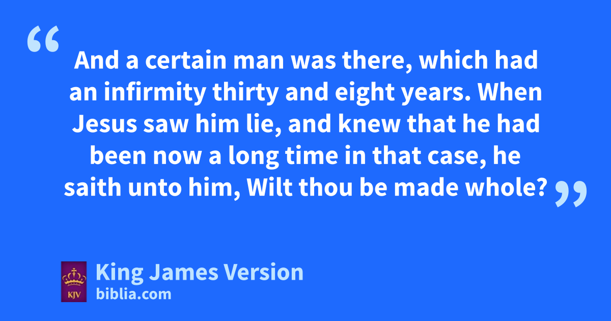 5 *After this there was aa feast of the Jews; and Jesus bwent up to Jerusalem. 2 Now there is at Jerusalem by the sheep ||market a pool, which is called bbin the Hebrew tongue Bethesda, having five porches. 3 In these lay a great multitude of impotent folk, of blind, halt, cwithered, waiting for the moving of the water. 4 For ccan angel went down at a certain season into the pool, and troubled the water: whosoever then first after the troubling of the water stepped in was made whole of whatsoever disease he had. 5 And a certain man was there, which had an infirmity thirty and eight years. 6 When Jesus saw him lie, and knew that he had been now a long time in that case, he saith unto him, Wilt thou be made whole? 7 The impotent man answered him, Sir, I have no man, when the water is troubled, to put me into the pool: but while I am coming, another steppeth down before me. 8 Jesus saith unto him, dRise, take up thy bed, and walk. 9 And immediately the man was made whole, and took up his bed, and walked: and on the same day ewas the sabbath. 10 fThe Jews therefore said unto him that was cured, It is the sabbath day: git is not lawful for thee to carry thy bed. 11 He answered them, He that made me whole, the same said unto me, Take up thy bed, and walk. 12 Then asked they him, What man is that which said unto thee, Take up thy bed, and walk? 13 And he that was healed wist not who it was: for Jesus had conveyed himself away, ||a multitude being in that place. 14 Afterward Jesus findeth him in the temple, and said unto him, Behold, thou art made whole: hsin no more, ilest a worse thing come unto thee. 15 The man departed, and told fthe Jews that it was Jesus, which had made him whole.