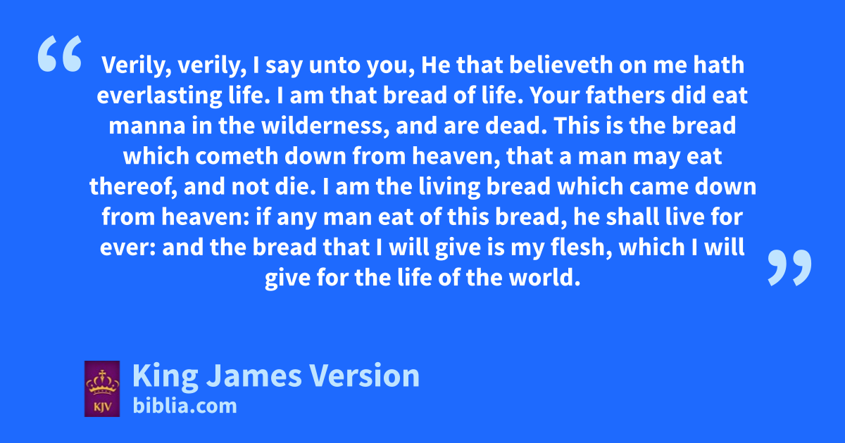 28 Then said they unto him, What shall we do, that we might work othe works of God? 29 Jesus answered and said unto them, This is othe work of God, pthat ye believe on him whom he hath sent. 30 They said therefore unto him, qWhat sign shewest thou then, that we may see, and believe thee? what dost thou work? 31 rOur fathers did eat manna in the desert; as it is written, sHe gave them bread from heaven to eat. 32 Then Jesus said unto them, Verily, verily, I say unto you, Moses gave you not that bread from heaven; but my Father giveth you the true bread from heaven. 33 For the bread of God is the which cometh down from heaven, and giveth life unto the world. 34 Then said they unto him, uLord, evermore give us this bread. 35 And Jesus said unto them, xI am ythe bread of life: he that cometh to me shall never hunger; and zhe that believeth on me shall never thirst. 36 But I said unto you, aThat ye also have seen me, and believe not. 37 bAll that the Father giveth me shall come to me; and chim that cometh to me I will in no wise cast out. 38 For dI came down from heaven, not to do emine own will, but ethe will of him that sent me. 39 And this is the Father’s will which hath sent me, that of ball which he hath given me fI should lose nothing, but gshould raise it up again at the last day. 40 And this is the will of him that sent me, that every one which hseeth the Son, and ibelieveth on him, may have keverlasting life: and I will raise him up at the last day. 41 lThe Jews then murmured at him, because he said, mI am the bread which came down from heaven. 42 And they said, Is not this Jesus, nthe son of Joseph, whose father and mother we know? how is it then that he saith, dI came down from heaven? 43 Jesus therefore answered and said unto them, Murmur not among yourselves. 44 No man can come to me, except the Father which hath sent me odraw him: and gI will raise him up at the last day. 45 It is written pin the prophets, qAnd they shall be all taught of God. Every man therefore that hath heard, and rhath learned of the Father, cometh unto me. 46 sNot that any man hath seen the Father, tsave he which is uof God, he hath seen the Father. 47 Verily, verily, I say unto you, xHe that believeth on me hath everlasting life. 48 yI am that bread of life. 49 zYour fathers did eat manna in the wilderness, and are dead. 50 This is the bread awhich cometh down from heaven, that a man may eat thereof, and bnot die. 51 I am cthe living bread dwhich came down from heaven: eif any man eat of this bread, he shall live for ever: and fthe bread that I will give is my flesh, which gI will give for the life of the world. 52 hThe Jews therefore istrove among themselves, saying, kHow can this man give us his flesh to eat? 53 Then Jesus said unto them, Verily, verily, I say unto you, Except lye eat the flesh of the Son of man, and lmdrink his blood, ye have no life in you. 54 Whoso eateth my flesh, and drinketh my blood, nhath eternal life; and oI will raise him up at the last day. 55 For my flesh is meat indeed, and my blood is drink indeed. 56 He that eateth my flesh, and drinketh my blood, pdwelleth in me, and I in him. 57 As the living Father hath sent me, and qI live by the Father: so he that eateth me, reven he shall live by me. 58 This is sthat bread twhich came down from heaven: unot as your fathers did eat manna, and are dead: ehe that eateth of this bread shall live for ever. 59 These things said he in the synagogue, as he taught in xCapernaum.