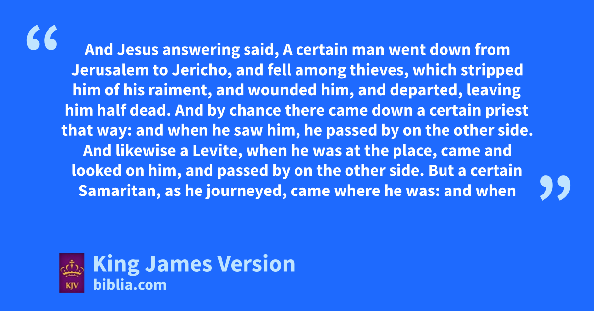 25 And, behold, a certain jlawyer stood up, and ktempted him, saying, lMaster, what shall I do to inherit eternal life? 26 He said unto him, What is written in the law? how readest thou? 27 And he answering said, mThou shalt love the Lord thy God with all thy heart, and with all thy soul, and with all thy strength, and with all thy mind; and nthy neighbour as thyself. 28 And he said unto him, Thou hast answered right: this do, and othou shalt live. 29 But he, willing to pjustify himself, said unto Jesus, And who is my neighbour? 30 And Jesus answering said, A certain man qwent down from Jerusalem to rJericho, and fell among sthieves, which stripped him of his raiment, and wounded him, and departed, leaving him half dead. 31 And by chance there qcame down a certain priest that way: and when he saw him, he tpassed by on the other side. 32 And likewise a Levite, when he was at the place, came and looked on him, and tpassed by on the other side. 33 But a certain uSamaritan, as he journeyed, came where he was: and when he saw him, he had compassion on him, 34 And went to him, and xbound up his wounds, pouring in xoil and wine, and set him on his own beast, and brought him to an inn, and took care of him. 35 And on the morrow when he departed, he took out two ||pence, and gave them to the host, and said unto him, Take care of him; and whatsoever thou spendest more, when I come again, I will repay thee. 36 Which now of these three, thinkest thou, was neighbour unto him that fell among the sthieves? 37 And he said, He that yshewed mercy on him. Then said Jesus unto him, Go, and do thou likewise.