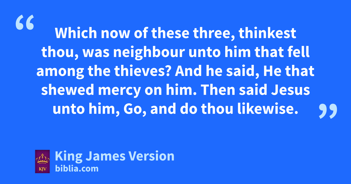 25 And, behold, a certain jlawyer stood up, and ktempted him, saying, lMaster, what shall I do to inherit eternal life? 26 He said unto him, What is written in the law? how readest thou? 27 And he answering said, mThou shalt love the Lord thy God with all thy heart, and with all thy soul, and with all thy strength, and with all thy mind; and nthy neighbour as thyself. 28 And he said unto him, Thou hast answered right: this do, and othou shalt live. 29 But he, willing to pjustify himself, said unto Jesus, And who is my neighbour? 30 And Jesus answering said, A certain man qwent down from Jerusalem to rJericho, and fell among sthieves, which stripped him of his raiment, and wounded him, and departed, leaving him half dead. 31 And by chance there qcame down a certain priest that way: and when he saw him, he tpassed by on the other side. 32 And likewise a Levite, when he was at the place, came and looked on him, and tpassed by on the other side. 33 But a certain uSamaritan, as he journeyed, came where he was: and when he saw him, he had compassion on him, 34 And went to him, and xbound up his wounds, pouring in xoil and wine, and set him on his own beast, and brought him to an inn, and took care of him. 35 And on the morrow when he departed, he took out two ||pence, and gave them to the host, and said unto him, Take care of him; and whatsoever thou spendest more, when I come again, I will repay thee. 36 Which now of these three, thinkest thou, was neighbour unto him that fell among the sthieves? 37 And he said, He that yshewed mercy on him. Then said Jesus unto him, Go, and do thou likewise.