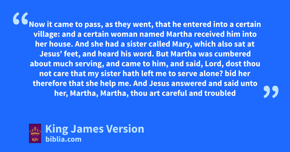 38 Now it came to pass, as they went, that he entered into a certain village: and a certain woman named zMartha areceived him into her house. 39 And she had a sister called bMary, which also csat at Jesus’ feet, and heard his word. 40 But zMartha was cumbered about much serving, and came to him, and said, Lord, dost thou not care that my sister hath left me to serve alone? bid her therefore that she help me. 41 And Jesus answered and said unto her, zMartha, Martha, dthou art careful and troubled about many things: 42 But eone thing is needful: and Mary hath chosen fthat good part, which shall not be taken away from her.