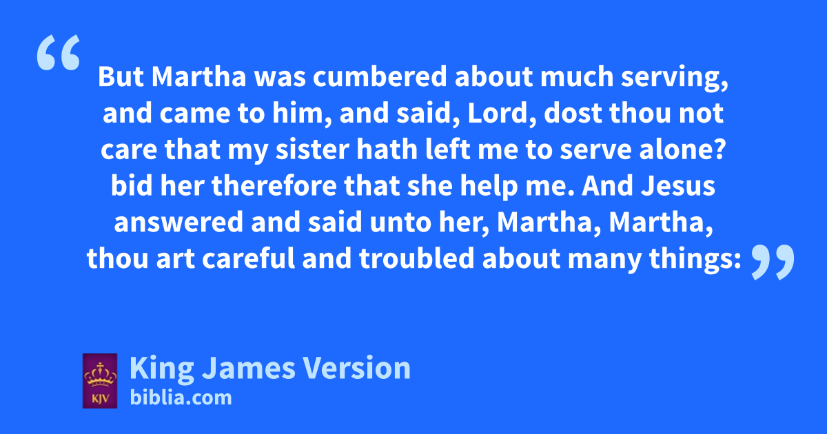 38 Now it came to pass, as they went, that he entered into a certain village: and a certain woman named zMartha areceived him into her house. 39 And she had a sister called bMary, which also csat at Jesus’ feet, and heard his word. 40 But zMartha was cumbered about much serving, and came to him, and said, Lord, dost thou not care that my sister hath left me to serve alone? bid her therefore that she help me. 41 And Jesus answered and said unto her, zMartha, Martha, dthou art careful and troubled about many things: 42 But eone thing is needful: and Mary hath chosen fthat good part, which shall not be taken away from her.