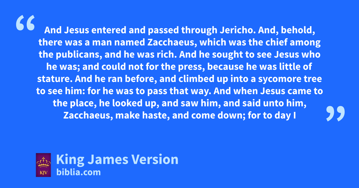 19 And Jesus aentered and passed through Jericho. 2 And, behold, there was a man named bZacchaeus, which was the chief among the publicans, and he was rich. 3 And he sought cto see Jesus who he was; and could not for the press, because he was little of dstature. 4 And he ran before, and climbed up into a esycomore tree to see him: for he was to pass that way. 5 And when Jesus came to the place, he looked up, and saw him, and said unto him, Zacchaeus, make haste, and come down; for to day I must fabide at thy house. 6 And he made haste, and came down, and greceived him joyfully. 7 And when they saw it, they all hmurmured, saying, hThat he was gone ito be guest with a man that is a sinner. 8 And Zacchaeus stood, and said unto the Lord; Behold, Lord, the half of my goods I give to the poor; and if I have ktaken any thing from any man kby false accusation, I restore him lfourfold. 9 And Jesus said unto him, This day is salvation come to this house, mforsomuch as nhe also is oa son of Abraham. 10 pFor the Son of man is come to qseek and to save that which was lost.