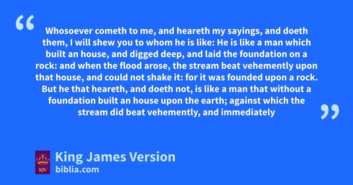 46 lAnd why call ye me, Lord, Lord, and do not the things which I say? 47 Whosoever cometh to me, and mheareth my sayings, and doeth them, I will shew you to whom he is like: 48 He is like a man which built an house, and digged deep, and laid the foundation on a rock: and when the flood arose, the stream beat vehemently upon that house, and could not shake it: for it was founded upon a rock. 49 But he that heareth, and doeth not, is like a man that nwithout a foundation built an house nupon the earth; against which the stream did beat vehemently, and immediately it fell; and the ruin of that house was great.