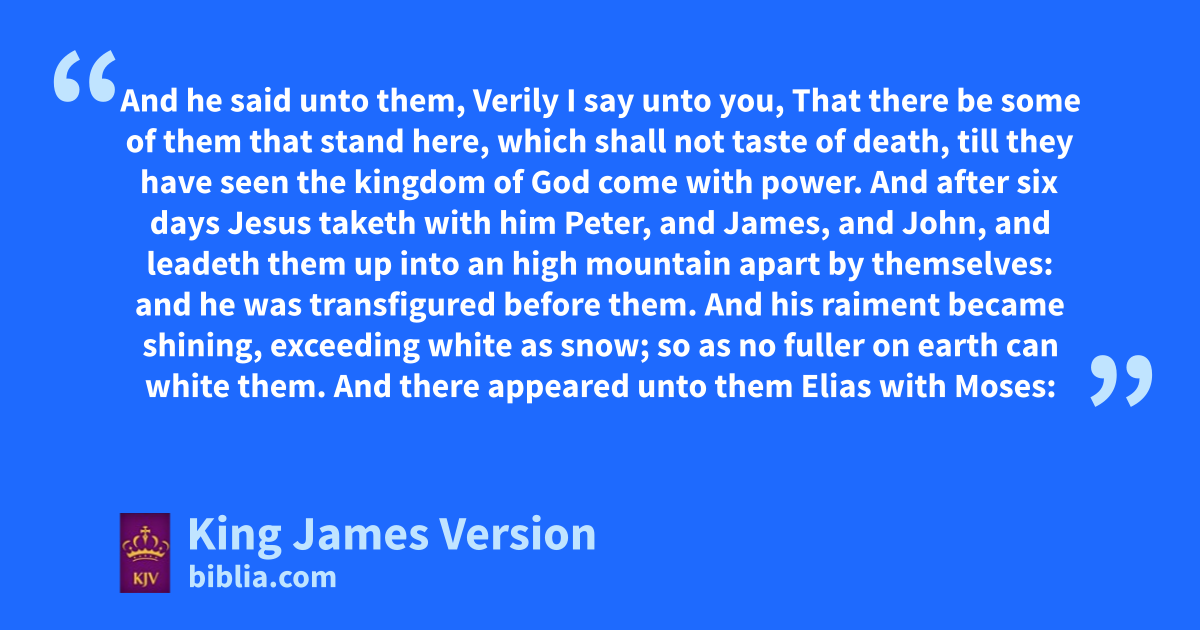 2 bAnd after six days Jesus taketh with him Peter, and James, and John, and leadeth them up into an high mountain apart by themselves: and he was transfigured before them. 3 And his raiment became shining, exceeding cwhite as snow; so as no fuller on earth can white them. 4 And there appeared unto them Elias with Moses: and they were talking with Jesus. 5 And Peter answered and said to Jesus, ccMaster, it is good for us to be here: and let us make three tabernacles; one for thee, and one for Moses, and one for Elias. 6 dFor he wist not what to say; for they were sore afraid. 7 And there was a cloud that overshadowed them: and a voice came out of the cloud, saying, This is my beloved Son: hear him. 8 And suddenly, when they had looked round about, they saw no man any more, save Jesus only with themselves.