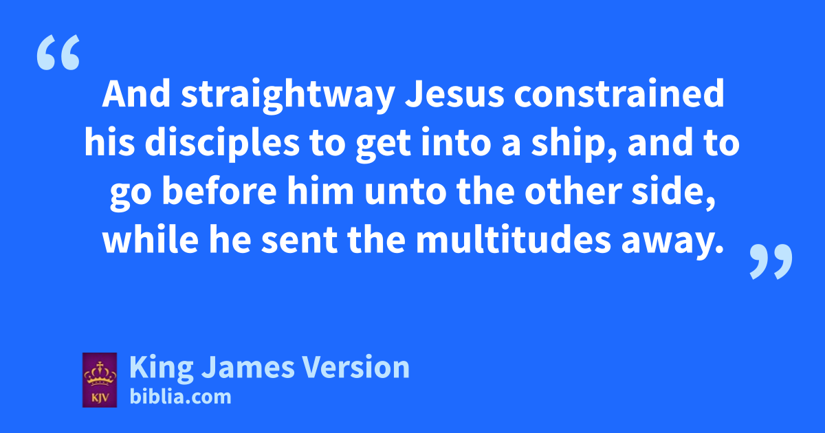 22 wAnd straightway Jesus constrained his disciples to get into a ship, and to go before him unto the other side, while he sent the multitudes away. 23 And when he had sent the multitudes away, he went up xinto a mountain apart to pray: and when the evening was come, he was there alone. 24 But the ship was now in the midst of the sea, tossed with waves: for the wind was contrary. 25 And in the yfourth watch of the night Jesus went unto them, walking on the sea. 26 And when the disciples saw him zwalking on the sea, they were troubled, saying, It is aa spirit; and they cried out for fear. 27 But straightway Jesus spake unto them, saying, Be of good cheer; it is I; bbe not afraid. 28 And Peter answered him and said, Lord, if it be thou, bid me come unto thee on the water. 29 And he said, Come. And when Peter was come down out of the ship, he walked on the water, to go to Jesus. 30 But when he saw the wind ||boisterous, he was afraid; and beginning to sink, he cried, saying, Lord, save me. 31 And immediately Jesus stretched forth his hand, and caught him, and said unto him, cO thou of little faith, wherefore didst thou doubt? 32 And when they were come into the ship, the wind ceased. 33 Then they that were in the ship came and dworshipped him, saying, Of a truth thou art ethe Son of God.