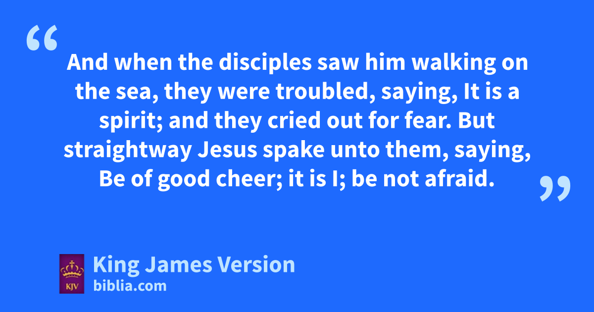 22 wAnd straightway Jesus constrained his disciples to get into a ship, and to go before him unto the other side, while he sent the multitudes away. 23 And when he had sent the multitudes away, he went up xinto a mountain apart to pray: and when the evening was come, he was there alone. 24 But the ship was now in the midst of the sea, tossed with waves: for the wind was contrary. 25 And in the yfourth watch of the night Jesus went unto them, walking on the sea. 26 And when the disciples saw him zwalking on the sea, they were troubled, saying, It is aa spirit; and they cried out for fear. 27 But straightway Jesus spake unto them, saying, Be of good cheer; it is I; bbe not afraid. 28 And Peter answered him and said, Lord, if it be thou, bid me come unto thee on the water. 29 And he said, Come. And when Peter was come down out of the ship, he walked on the water, to go to Jesus. 30 But when he saw the wind ||boisterous, he was afraid; and beginning to sink, he cried, saying, Lord, save me. 31 And immediately Jesus stretched forth his hand, and caught him, and said unto him, cO thou of little faith, wherefore didst thou doubt? 32 And when they were come into the ship, the wind ceased. 33 Then they that were in the ship came and dworshipped him, saying, Of a truth thou art ethe Son of God.