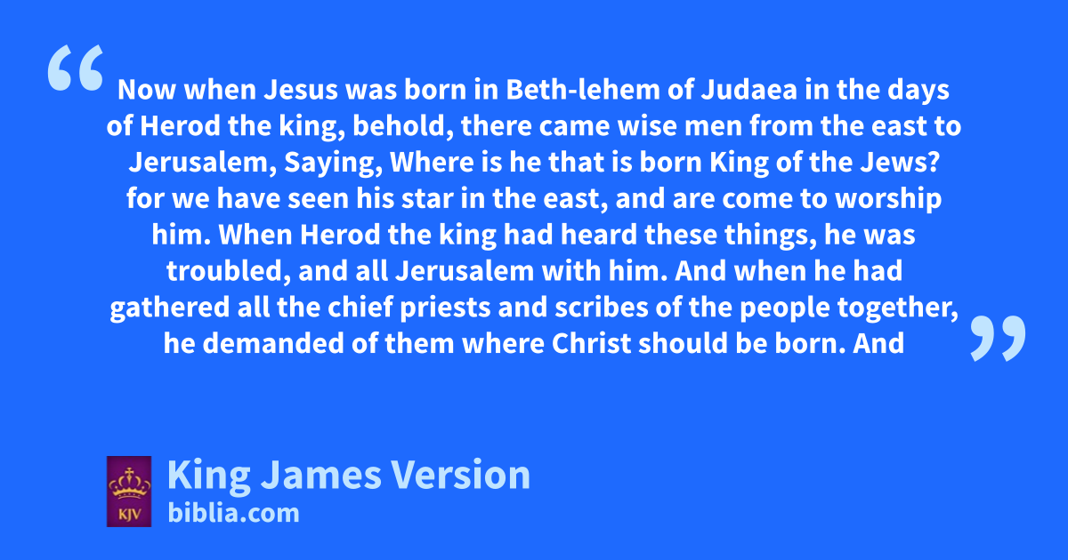 2 Now when aJesus was born in Beth-lehem of Judaea in the days of Herod the king, behold, there came bwise men cfrom the east to Jerusalem, 2 Saying, dWhere is he that is born King of the Jews? for we have seen ehis star in the east, and are come to worship him. 3 When Herod the king had heard these things, he was troubled, and all Jerusalem with him. 4 And when he had gathered all the chief priests and fscribes of the people together, ghe demanded of them where Christ should be born. 5 And they said unto him, In Beth-lehem of Judaea: for thus it is written by the prophet, 6 hAnd thou Beth-lehem, in the land of Juda, art not the least among the princes of Juda: for out of thee shall come a Governor, that shall ||rule my people Israel. 7 Then Herod, when he had privily called the wise men, inquired of them diligently what time the star appeared. 8 And he sent them to Beth-lehem, and said, Go and search diligently for the young child; and when ye have found him, bring me word again, that I may come and worship him also. 9 When they had heard the king, they departed; and, lo, the star, which they saw in the east, went before them, till it came and stood over where the young child was. 10 When they saw the star, they irejoiced with exceeding great joy. 11 And when they were come into the house, they saw the young child with Mary his mother, and fell down, and worshipped him: and when they had opened their treasures, jthey ||presented unto him gifts; kgold, and kfrankincense, and lmyrrh. 12 And being warned of God min a dream that they should not return to Herod, they departed into their own country another way.