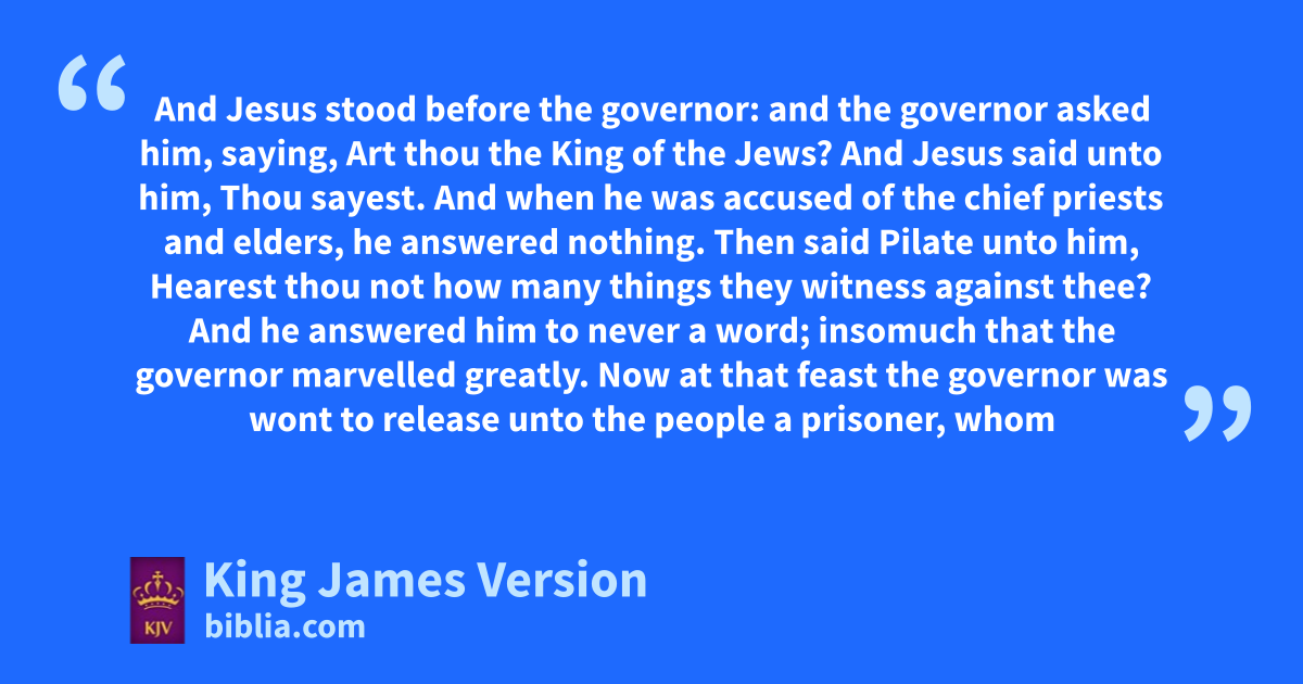 11 And Jesus stood before the governor: qand the governor asked him, saying, Art thou the King of the Jews? And Jesus said unto him, rThou sayest. 12 And when he was accused of the chief priests and elders, she answered nothing. 13 Then said Pilate unto him, tHearest thou not how many things they witness against thee? 14 And he answered him sto never a word; insomuch that the governor marvelled greatly.