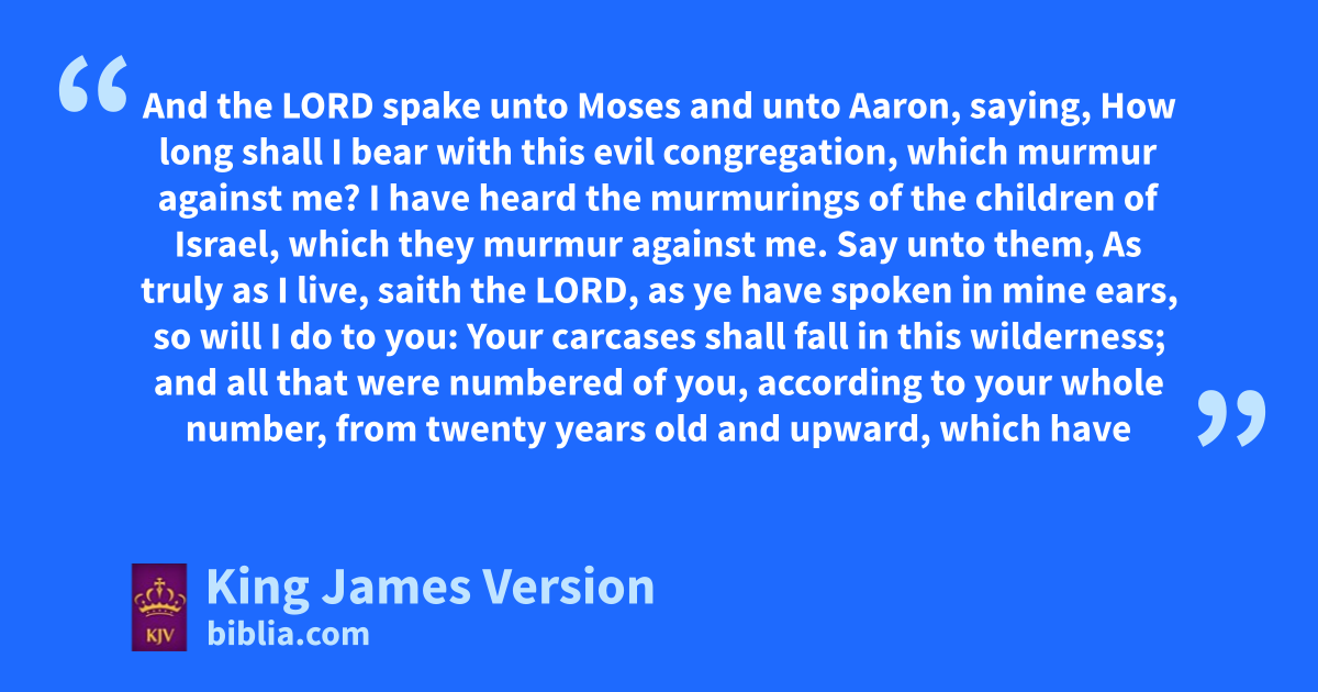 26 And the Lord spake unto Moses and unto Aaron, saying, 27 How long shall I bear with this evil congregation, which murmur against me? pI have heard the murmurings of the children of Israel, which they murmur against me. 28 Say unto them, qAs truly as I live, saith the Lord, ras ye have spoken in mine ears, so will I do to you: 29 Your carcases shall fall in this wilderness; and sall that were numbered of you, according to your whole number, from twenty years old and upward, which have murmured against me, 30 Doubtless ye shall not come into the land, concerning which I †sware to make you dwell therein, tsave Caleb the son of Jephunneh, and Joshua the son of Nun. 31 uBut your little ones, which ye said should be a prey, them will I bring in, and they shall know the land which xye have despised. 32 But as for you, yyour carcases, they shall fall in this wilderness. 33 And your children shall ||zwander in the wilderness aforty years, and bbear your whoredoms, until your carcases be wasted in the wilderness. 34 cAfter the number of the days in which ye searched the land, even dforty days, each day for a year, shall ye ebear your iniquities, even forty years, and ye shall know my ||breach of promise. 35 fI the Lord have said, I will surely do it unto all gthis evil congregation, that are gathered together against me: in this wilderness they shall be consumed, and there they shall die. 36 hAnd the men, which Moses sent to search the land, who returned, and made all the congregation to murmur against him, by bringing up a slander upon the land, 37 Even those men that did bring up the evil report upon the land, idied by the plague before the Lord. 38 kBut Joshua the son of Nun, and Caleb the son of Jephunneh, which were of the men that went to search the land, lived still. 39 And Moses told these sayings unto all the children of Israel: and the people lmourned greatly.