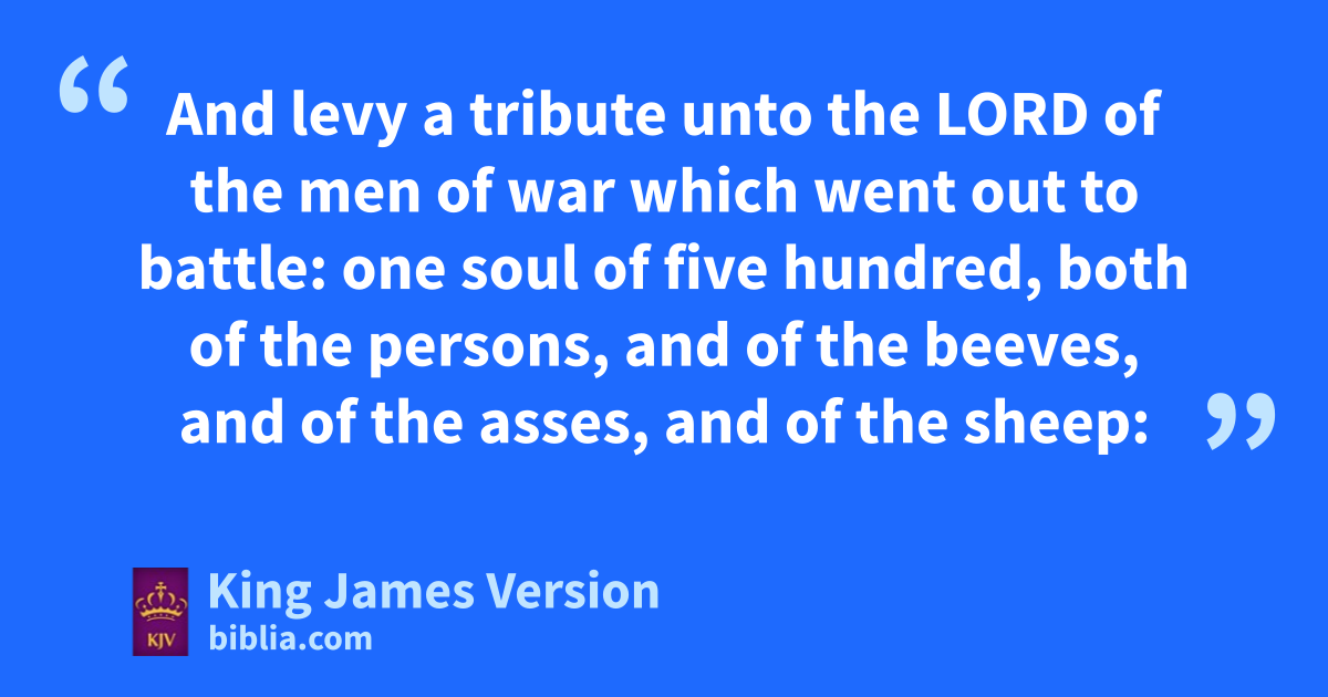 25 And the Lord spake unto Moses, saying, 26 Take the sum of the prey †that was taken, both of man and of beast, thou, and Eleazar the priest, and the chief fathers of the congregation: 27 And ydivide the prey into two parts; between them that took the war upon them, who went out to battle, and between all the congregation: 28 And levy a tribute unto the Lord of the men of war which went out to battle: zone soul of five hundred, both of the persons, and of the beeves, and of the asses, and of the sheep: 29 Take it of their half, and give it unto Eleazar the priest, for an heave offering of the Lord. 30 And of the children of Israel’s half, thou shalt take aone portion of fifty, of the persons, of the beeves, of the asses, and of the ||flocks, of all manner of beasts, and give them unto the Levites, bwhich keep the charge of the tabernacle of the Lord. 31 And Moses and Eleazar the priest did as the Lord commanded Moses. 32 And the booty, being the rest of the prey which the men of war had caught, was six hundred thousand and seventy thousand and five thousand sheep, 33 And threescore and twelve thousand beeves, 34 And threescore and one thousand asses, 35 And thirty and two thousand persons in all, of women that had not known man by lying with him. 36 And the half, which was the portion of them that went out to war, was in number three hundred thousand and seven and thirty thousand and five hundred sheep: 37 And cthe Lord’s tribute of the sheep was six hundred and threescore and fifteen. 38 And the beeves were thirty and six thousand; of which cthe Lord’s tribute was threescore and twelve. 39 And the asses were thirty thousand and five hundred; of which cthe Lord’s tribute was threescore and one. 40 And the persons were sixteen thousand; of which cthe Lord’s tribute was thirty and two persons. 41 And Moses gave the tribute, which was the Lord’s heave offering, unto Eleazar the priest, das the Lord commanded Moses. 42 And of the children of Israel’s half, which Moses divided from the men that warred, 43 (Now the half that pertained unto the congregation was three hundred thousand and thirty thousand and seven thousand and five hundred sheep, 44 And thirty and six thousand beeves, 45 And thirty thousand asses and five hundred, 46 And sixteen thousand persons;) 47 Even eof the children of Israel’s half, Moses took one portion of fifty, both of man and of beast, and gave them unto the Levites, which kept the charge of the tabernacle of the Lord; as the Lord commanded Moses.