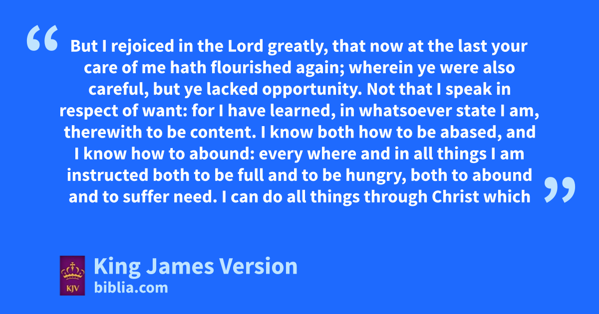 10 But I rejoiced in the Lord greatly, that now at the last yyour care of me ||hath flourished again; zwherein ye were also careful, but aye lacked opportunity. 11 Not that I speak in respect of bwant: for I have learned, in whatsoever state I am, therewith to be ccontent. 12 I know both how to be abased, and I know how to abound: every where and in all things I am instructed dboth to be full and to be hungry, both to abound and to suffer need. 13 I can do all things ethrough Christ fwhich strengtheneth me. 14 Notwithstanding ye have well done, that gye did communicate with my affliction. 15 Now ye Philippians know also, that hin the beginning of the gospel, when I departed from iMacedonia, kno church communicated with me as concerning lgiving and receiving, but ye only. 16 For even in mThessalonica ye sent once and again unto my nnecessity. 17 oNot because I desire a gift: but I desire pfruit that may abound to your account. 18 But ||I qhave all, and abound: I am full, rhaving received of Epaphroditus the things which were sent from you, san odour of a sweet smell, ta sacrifice acceptable, uwellpleasing to God. 19 But my God wshall supply all your nneed xaccording to his riches yin glory by Christ Jesus. 20 Now unto zGod and our Father be aglory for ever and ever. Amen.