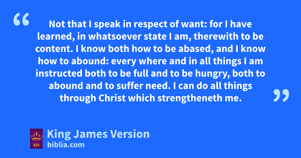 10 But I rejoiced in the Lord greatly, that now at the last yyour care of me ||hath flourished again; zwherein ye were also careful, but aye lacked opportunity. 11 Not that I speak in respect of bwant: for I have learned, in whatsoever state I am, therewith to be ccontent. 12 I know both how to be abased, and I know how to abound: every where and in all things I am instructed dboth to be full and to be hungry, both to abound and to suffer need. 13 I can do all things ethrough Christ fwhich strengtheneth me. 14 Notwithstanding ye have well done, that gye did communicate with my affliction. 15 Now ye Philippians know also, that hin the beginning of the gospel, when I departed from iMacedonia, kno church communicated with me as concerning lgiving and receiving, but ye only. 16 For even in mThessalonica ye sent once and again unto my nnecessity. 17 oNot because I desire a gift: but I desire pfruit that may abound to your account. 18 But ||I qhave all, and abound: I am full, rhaving received of Epaphroditus the things which were sent from you, san odour of a sweet smell, ta sacrifice acceptable, uwellpleasing to God. 19 But my God wshall supply all your nneed xaccording to his riches yin glory by Christ Jesus. 20 Now unto zGod and our Father be aglory for ever and ever. Amen.