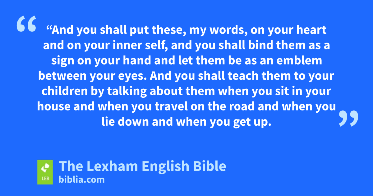 18 “And you shall put these, my words, on your heart and on your inner self,x and you shall bind them as a sign on your hand and let them be as an emblem between your eyes. 19 And you shall teach them to your childreny by talking about them when you sit in your house and when you travel on the road and when you lie down and when you get up. 20 And you shall write them on the doorframes of your house and on your gates, 21 so that they may multiply your days and the days of your children on the land that Yahweh swore to your ancestorsz to give it to them ⌊as long as heaven endures over the earth⌋.a 22 Yes, if you diligently keep allb this commandment that I am commanding you ⌊to observe it⌋, c by loving Yahweh your God ⌊by walking in⌋d all his ways and by holding fast to him, 23 then Yahweh will drive out all of these nations ⌊before you⌋,e and you will dispossess nations larger and more numerous than you. 24 Every place on which the sole of your foot treads, it shall be yours; your boundary shall be from the desert and Lebanon from the river, the river Euphrates, on up to the western sea.f 25 No one can take a stand ⌊against you⌋;g your dread and your fear Yahweh your God will put on the ⌊surface⌋h of all the land ⌊where you tread⌋,i just as he ⌊promised⌋j to you.