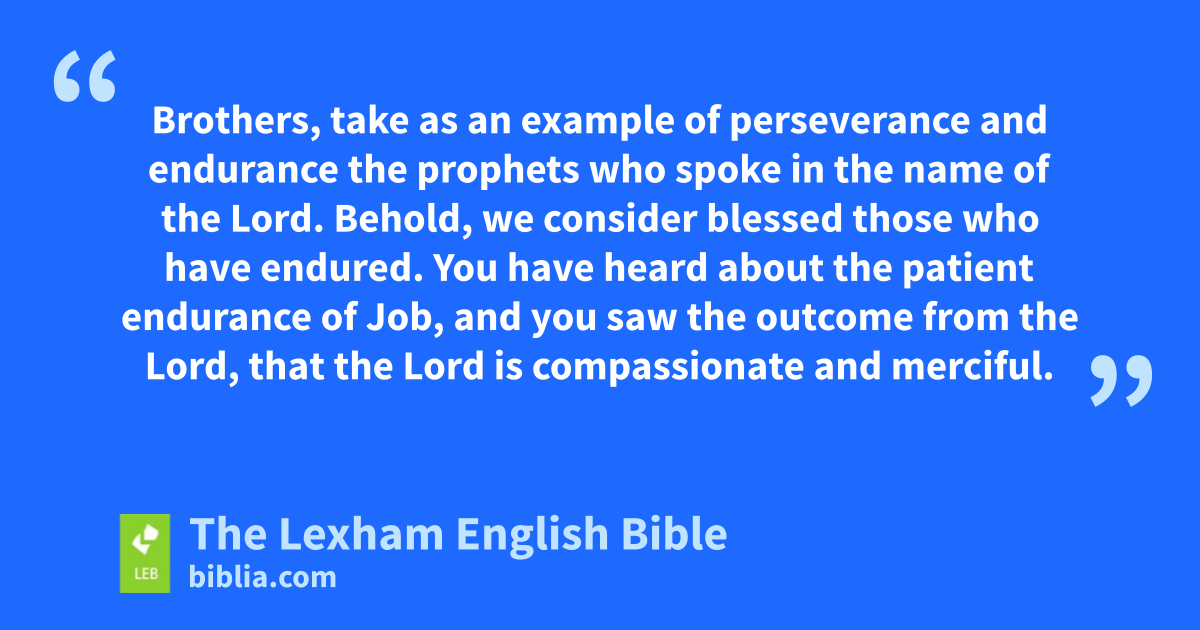 7 Therefore be patient, brothers, until the coming of the Lord. Behold, the farmer waits for the precious fruit of the soil, being patient concerning it until it receives the early and late rains. 8 You also be patient. Strengthen your hearts, because the coming of the Lord is near. 9 Brothers, do not complain against one another, in order that you may not be judged. Behold, the judge stands before the doors! 10 Brothers, take as an example of perseverance and endurance the prophets who spoke in the name of the Lord. 11 Behold, we consider blessed those who have endured. You have heard about the patient endurance of Job, and you saw the outcome from the Lord, that the Lord is compassionate and merciful. 12 Now above all, my brothers, do not swear either by heaven or by earth or by any other oath, but let your yes be yes and your no, no, in order that you may not fall under judgment.