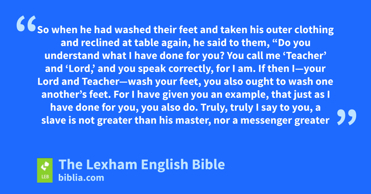12 So when he had washed their feet and taken his outer clothing and reclined at table again, he said to them, “Do you understand what I have done for you? 13 You call me ‘Teacher’ and ‘Lord,’ and you speak correctly, for I am. 14 If then I—your* Lord and Teacher—wash your feet, you also ought to wash one another’s feet. 15 For I have given you an example, that just as I have done for you, you also do. 16 Truly, truly I say to you, a slave is not greater than his master, nor a messenger greater than the one who sent him. 17 If you understand these things, you are blessed if you do them.
