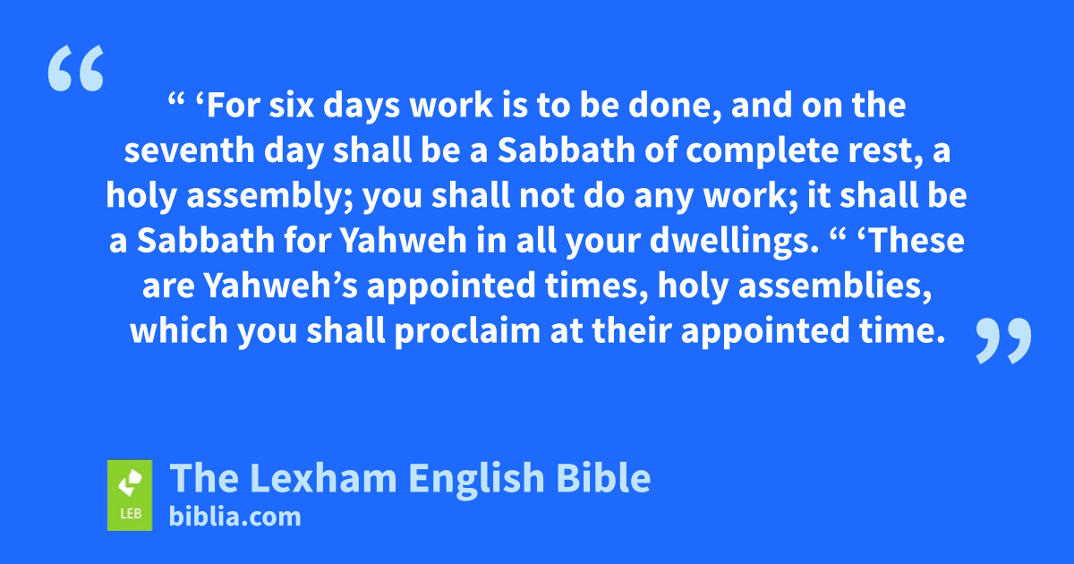 3 “ ‘For six days work is to be done, and on the seventh day shall be ⌊a Sabbath of complete rest⌋,c a holy assembly; you shall not do any work; it shall be a Sabbath for Yahweh in all your dwellings.