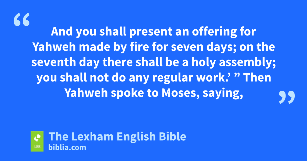 4 “ ‘These are Yahweh’s appointed times, holy assemblies, which you shall proclaim atd their appointed time. 5 In the first month, on the fourteenth of the month at the evening is Yahweh’s Passover. 6 And on the fifteenth day of this month is Yahweh’s Feast of Unleavened Bread; for seven days you shall eat unleavened bread. 7 On the first day there shall be a holy assembly for you; you shall not do ⌊any regular work⌋.e 8 And you shall present an offering for Yahweh made by fire for seven days; on the seventh day there shall be a holy assembly; you shall not do ⌊any regular work⌋.’ ”f