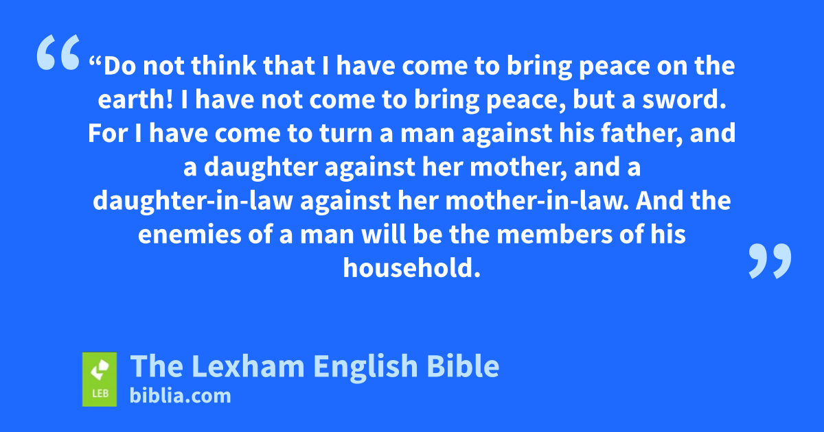 34 “Do not think that I have come to bring peace on the earth! I have not come to bring peace, but a sword. 35 For I have come to turn a man against his father, and a daughter against her mother, and a daughter-in-law against her mother-in-law. 36 And the enemies of a man will be the members of his household.h 37 The one who loves father or mother more than me is not worthy of me, and the one who loves son or daughter more than me is not worthy of me. 38 And whoever does not take up his cross and follow me is not worthy of me. 39 The one who finds his life will lose it, and the one who loses his life because of me will find it.