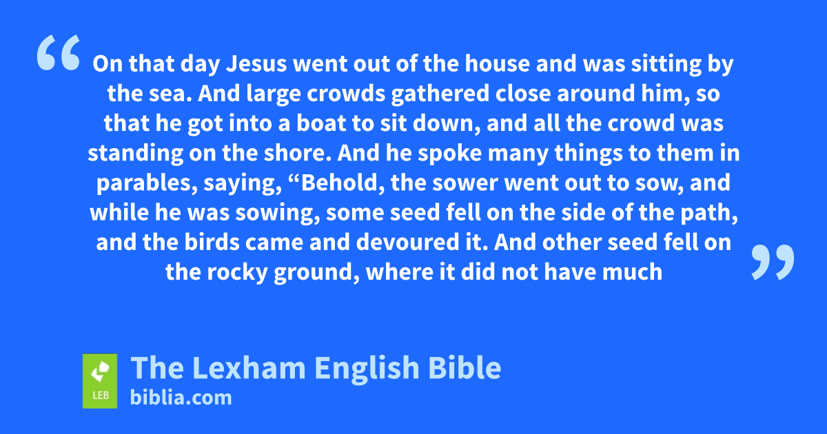 13 On that day Jesus went out of the house and* was sitting by the sea.a 2 And large crowds gathered close around him, so that he got into a boat to sit down, and all the crowd was standing on the shore. 3 And he spoke many things to them in parables, saying, “Behold, the sower went out to sow, 4 and while he was sowing, ⌊some seed⌋b fell on the side of the path, and the birds came and* devoured it. 5 And other seed fell on the rocky ground, where it did not have much soil, and it sprang up at once because it did not have any depth of soil. 6 But when* the sun rose it was scorched, and because it did not have enough root, it withered. 7 And other seed fell among the thorn plants, and the thorn plants came up and choked it. 8 But other seed fell on the good soil and produced grain,c this one a hundred times as much and this one sixty and this one thirty. 9 The one who has ears, let him hear!”