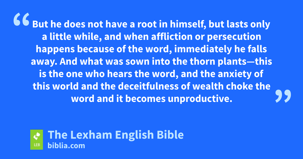 18 “You, therefore, listen to the parable of the sower: 19 When* anyone hears the word about the kingdom and does not understand it,* the evil one comes and snatches away what was sown in his heart. This is what was sown on the side of the path. 20 And what was sown on the rocky ground—this is the one who hears the word and immediately receives it with joy. 21 But he does not have a root in himself, but ⌊lasts only a little while⌋,h and when* affliction or persecution happens because of the word, immediately he falls away. 22 And what was sown into the thorn plants—this is the one who hears the word, and the anxiety of this worldi and the deceitfulness of wealth choke the word and it becomes unproductive. 23 But what was sown on the good soil—this is the one who hears the word and understands it,* who indeed bears fruit and produces, this one a hundred times as much, and this one sixty, and this one thirty.”