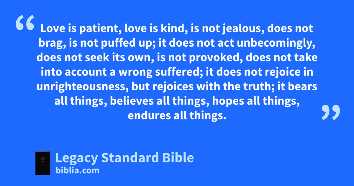 Love is patient, love is kind, is not jealous, does not brag, is not puffed up; it does not act unbecomingly, does not seek its own, is not provoked, does not take into account a wrong suffered; it does not rejoice in unrighteousness, but rejoices with the truth; it bears all things, believes all things, hopes all things, endures all things.